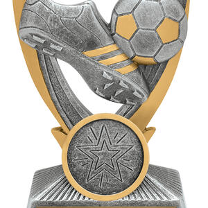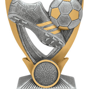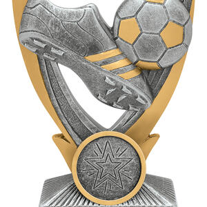A striking blend of gold and silver, this trophy is expertly crafted from durable resin. Designed with a bold football and shoe motif and highlighted by a star emblem at the base, it brings significance to football league trophies.