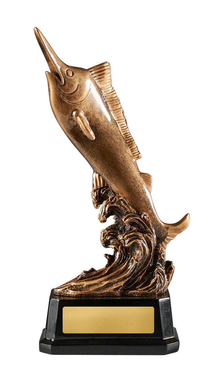 This resin Marlin Trophy features a sleek, sculpted marlin captured leaping from textured waves, finished in a gold style coating that highlights the graceful lines and movement of the fish. Mounted on a glossy black base, itÂ’s an impressive choice for fishing tournaments, club presentations and recognition of exceptional catches.