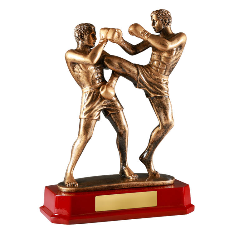 This antique gold resin kick boxing trophy captures the intensity and precision of combat with two fighters locked in a powerful action pose. Finished in a rich antique gold tone and mounted on a red base, it is a striking award choice for kick boxing tournaments, martial arts clubs, championships and presentation events.