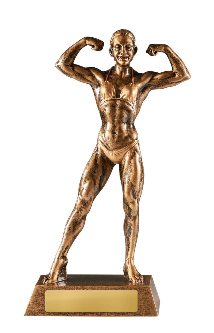 This antique gold resin Female Bodybuilding Trophy captures strength, symmetry, and discipline in a striking competition style pose. Sculpted with detailed muscular definition and a confident stance, itÂ’s mounted on a classic bevelled base with space for engraving. A bold and inspiring award for bodybuilding events, gym achievements, and fitness club presentations.