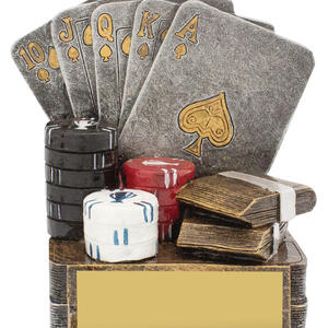 This bold resin poker trophy showcases detailed elements including cards, poker chips, and cash stacks in an antique gold and silver finish. Perfect for recognising winners in poker nights, casino events, or competitive card games.