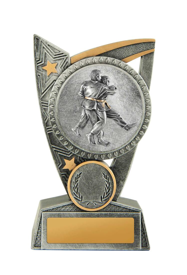 Celebrate martial arts achievement with this contemporary karate trophy, crafted in resin. The curved silver and gold design features a circular logo and a detailed depiction of two practitioners in a grappling move, reflecting technical skill and commitment.