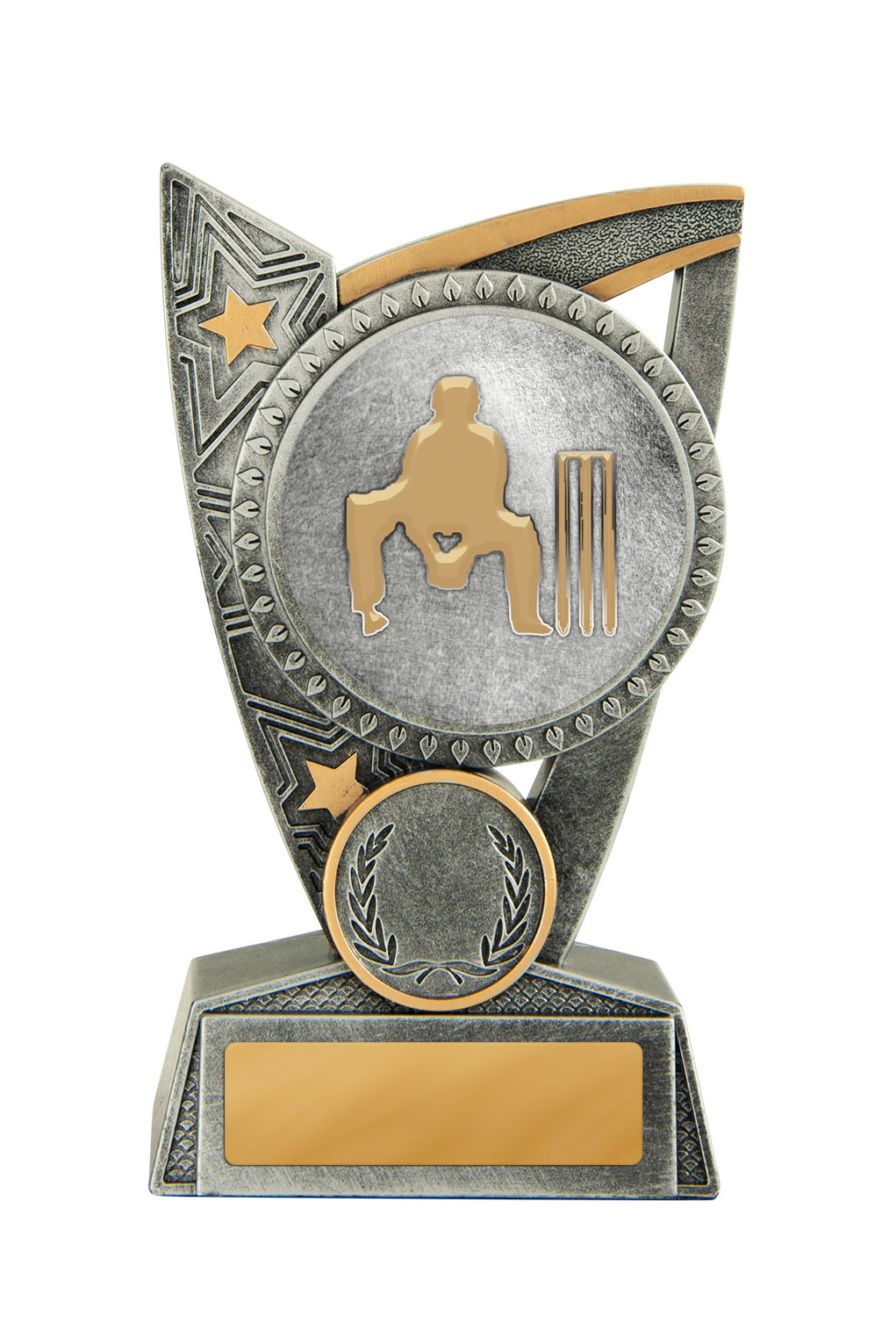Crafted for standout performance, this cricket trophy features a dynamic wicketkeeper silhouette with stumps accentuating the sport's key moments. The curved design and circular elements create a modern profile, while the resin material ensures a balance of durability and elegance. It's ideal for celebrating cricketing achievement with a distinctive, professional touch.