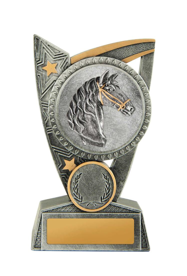 Distinguished by its elegant curved design, this horse trophy features a prominent horse head centrepiece framed by celebratory star accents. Crafted from resin, the piece is finished in a sophisticated palette of silver and gold. An integrated engraving plaque allows for personalisation, making it an ideal choice for equestrian achievement and recognition events.