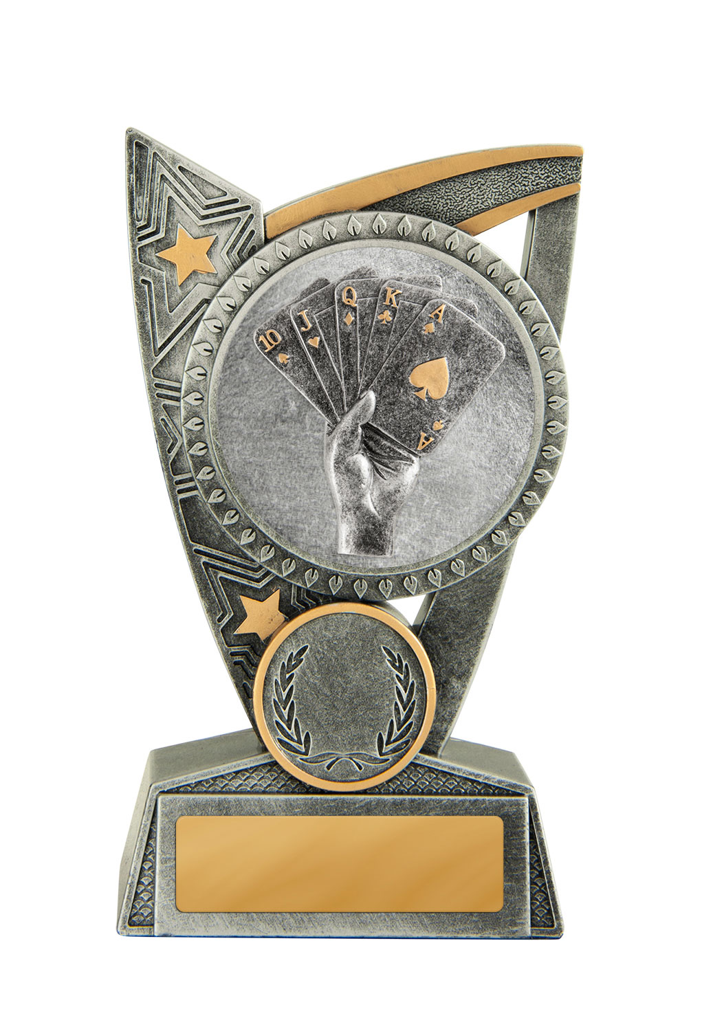 Celebrate card game mastery with this poker trophy, expertly crafted in a dynamic curved design. Finished in polished silver and gold tones, it showcases a detailed hand revealing a royal flush of spades, enhanced by decorative stars and laurel motifs. The circular 25mm centre adds a custom touch, making this an elegant recognition piece for poker and card game events.