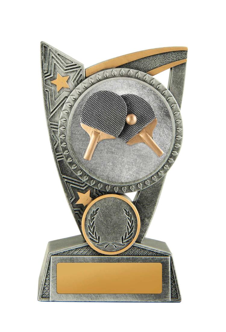 A contemporary table tennis trophy crafted in a curved form, this award stands out with its integrated paddles, ball, and refined star and laurel motif. Its distinctive design makes it a memorable choice for recognising achievement in table tennis competitions.