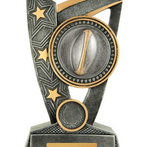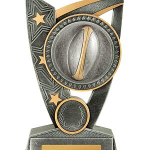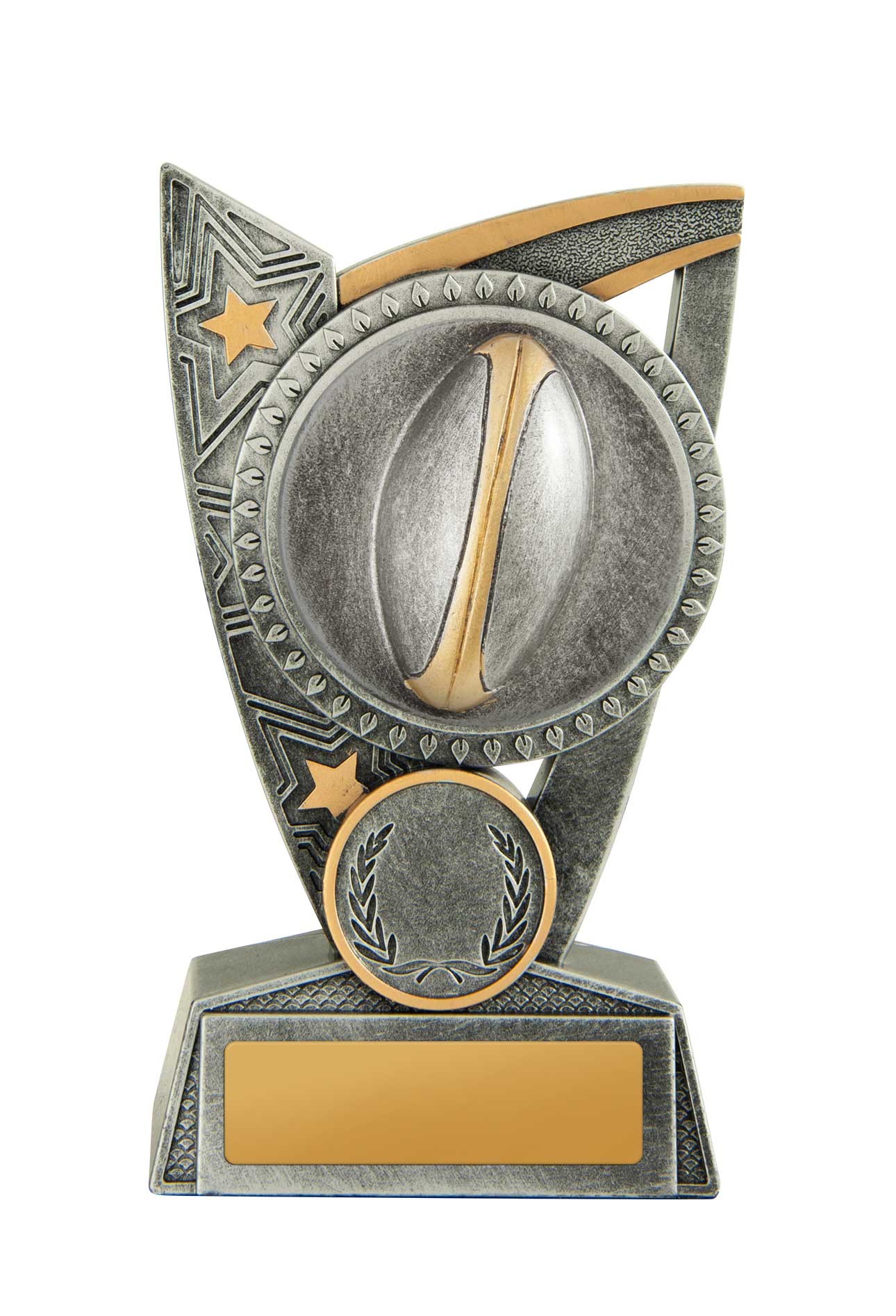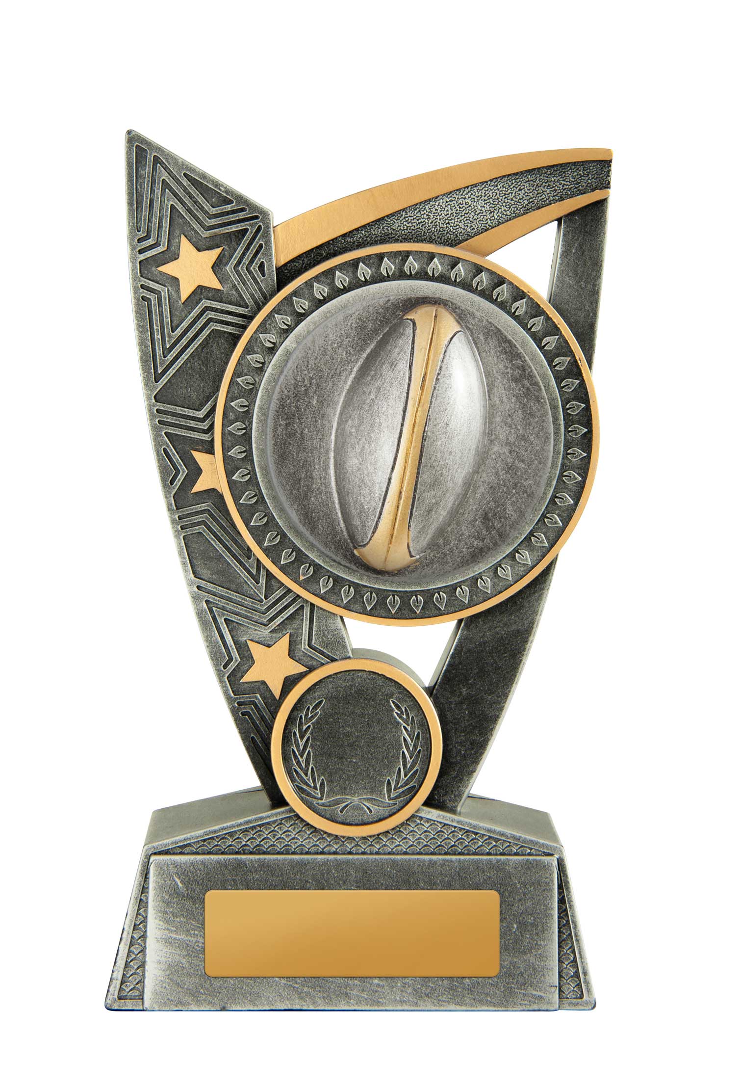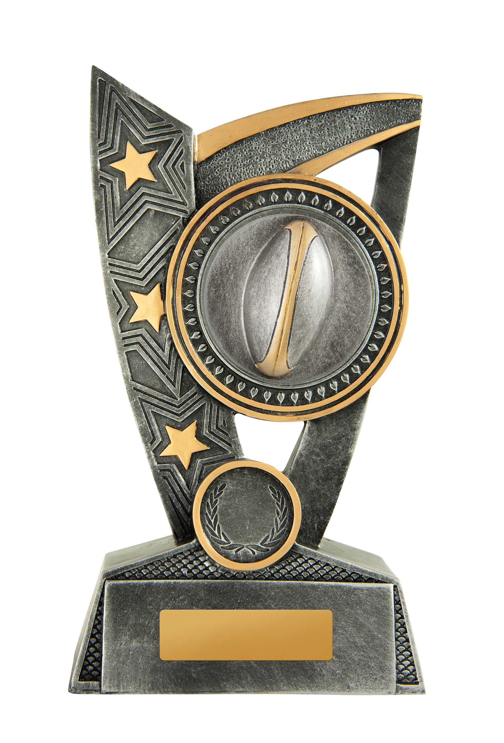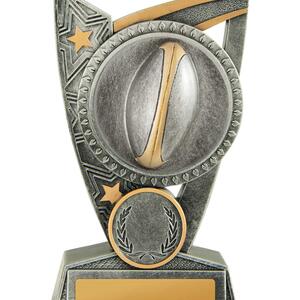 Celebrate rugby achievement with this elegant rugby league trophy or rugby union trophy, crafted in a striking gold and silver finish. The trophy features a dynamic rugby ball design set within a star, framed by a classic laurel wreath base for a sense of prestige.