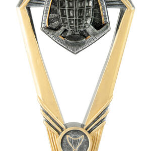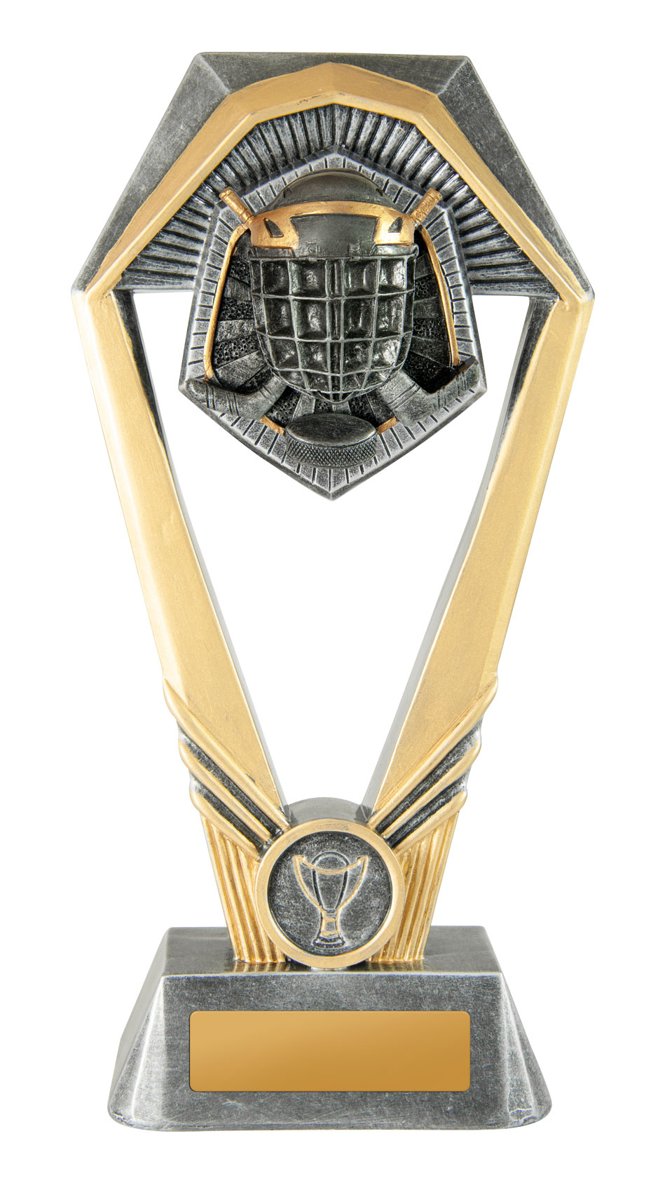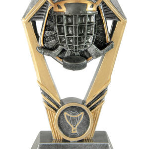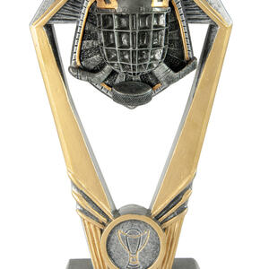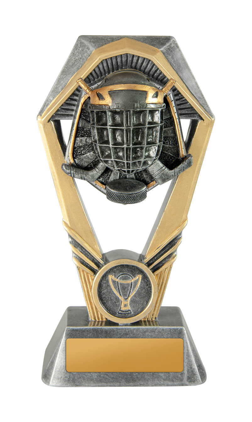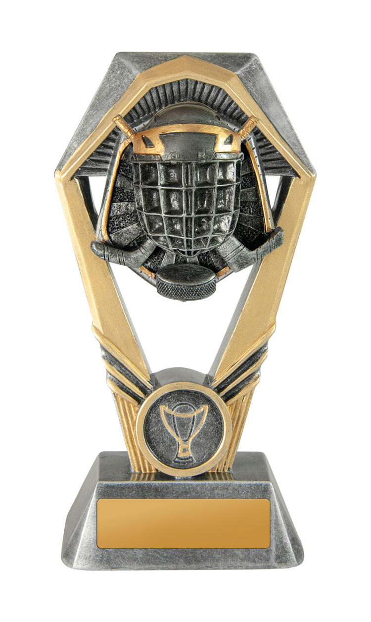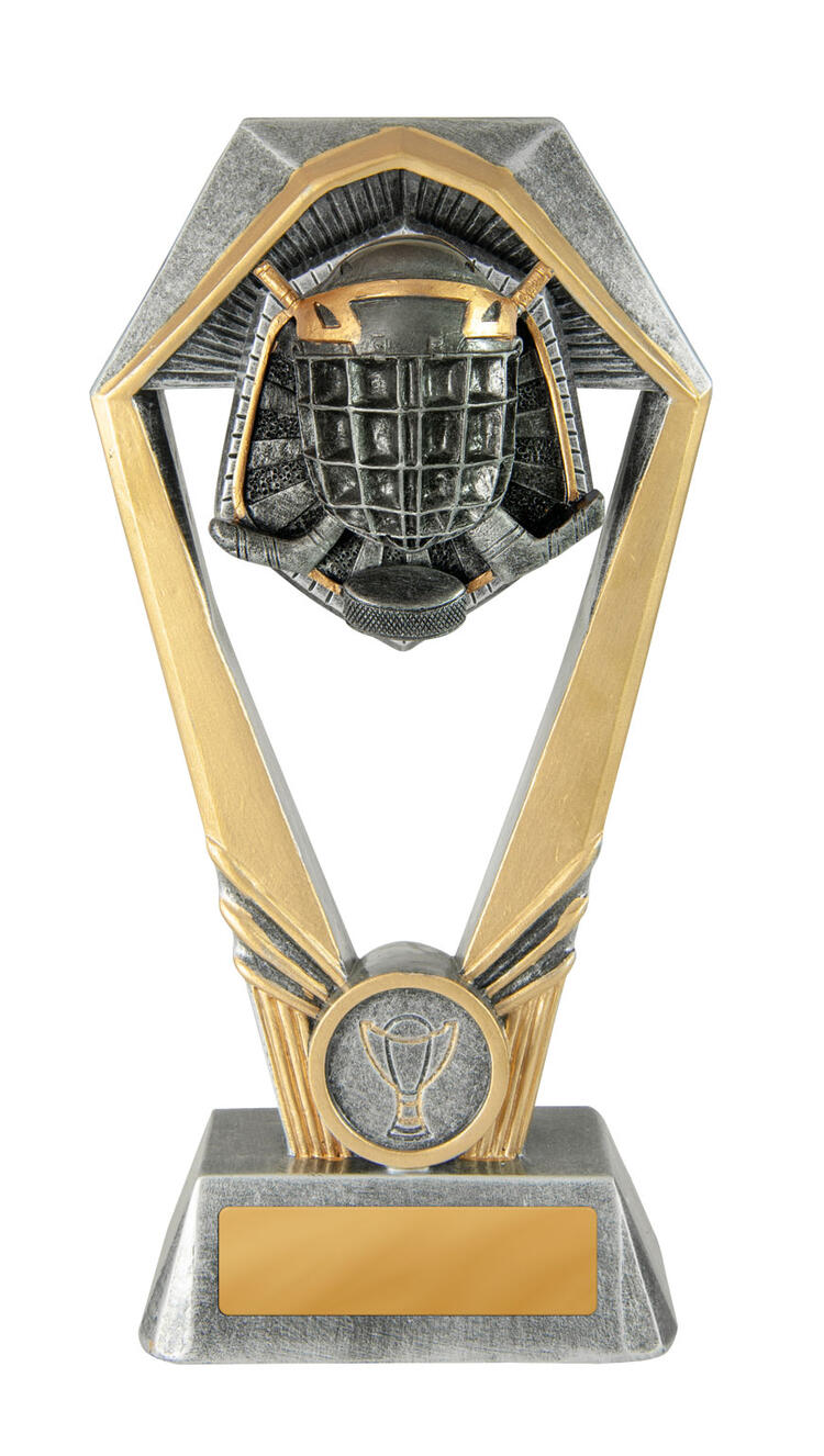 Showcasing a striking hexagonal frame and substantial base, this ice hockey trophy delivers a modern, professional feel. Crafted in gold and silver tones from resin, it features a detailed ice hockey helmet and sticks motif, complemented by a trophy emblem on the base.
