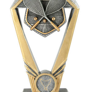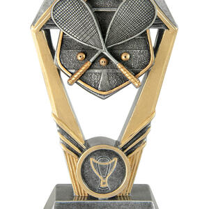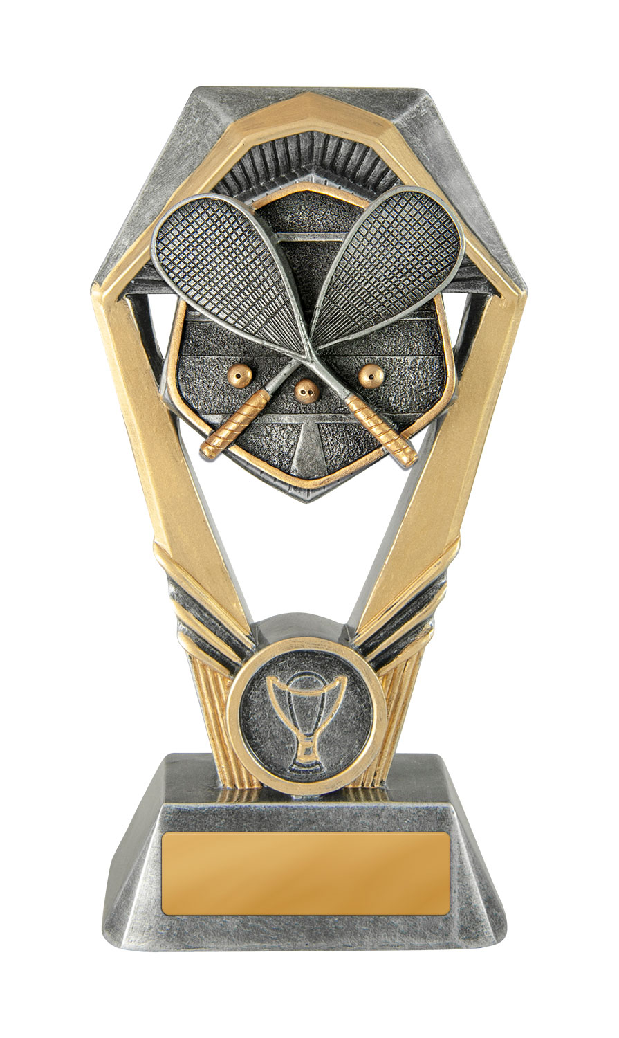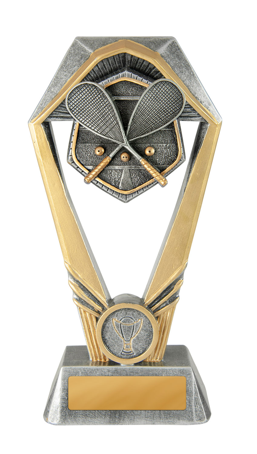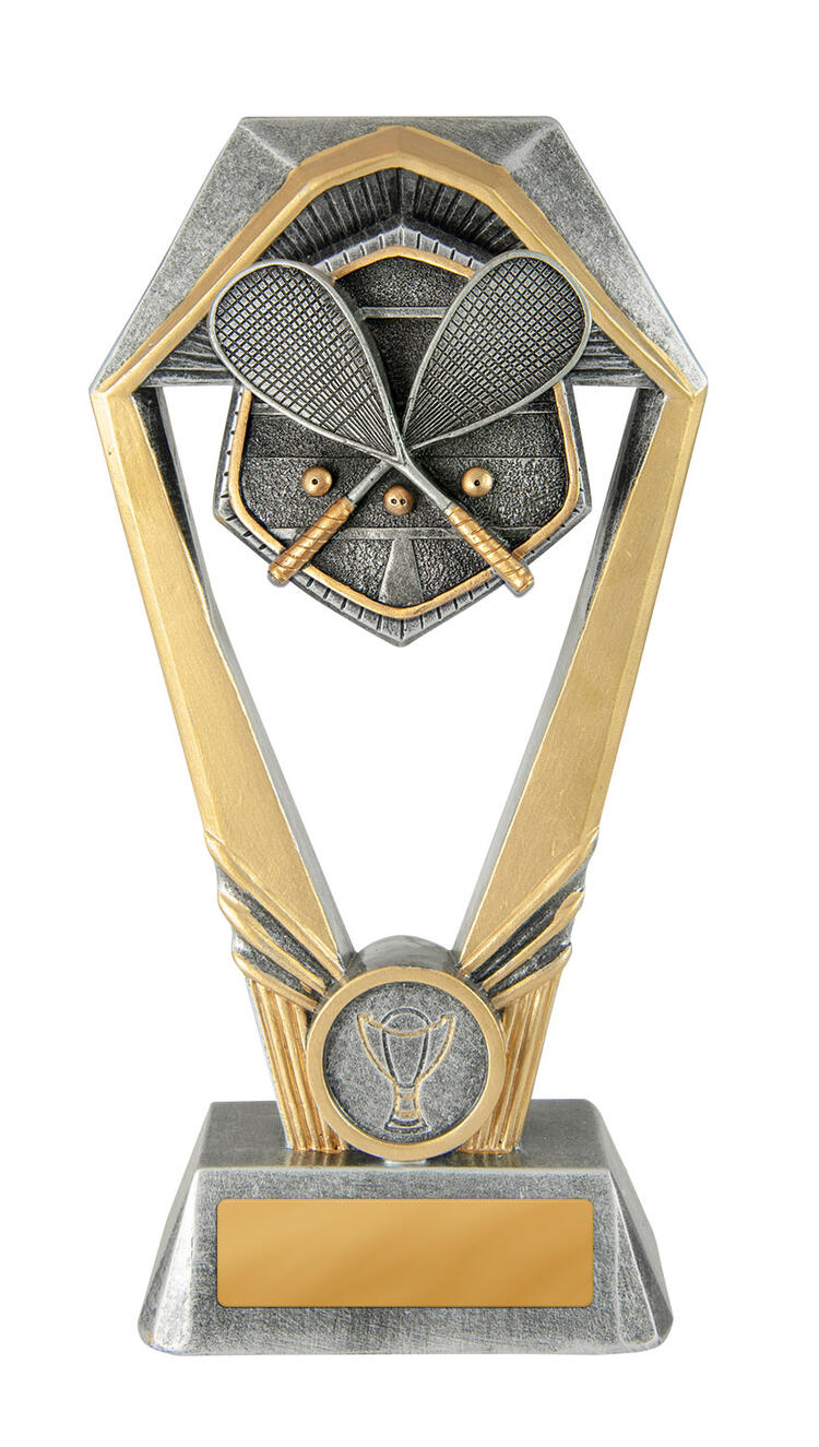 This squash trophy stands out with its elegant hexagonal top, rectangular base, and finely detailed crossed racquets and ball motif. It is crafted from resin to deliver a polished, durable award. The design includes a blank plaque, offering a refined canvas for personalisation to celebrate achievement in racquet sports.