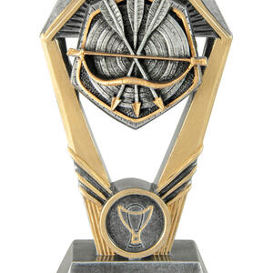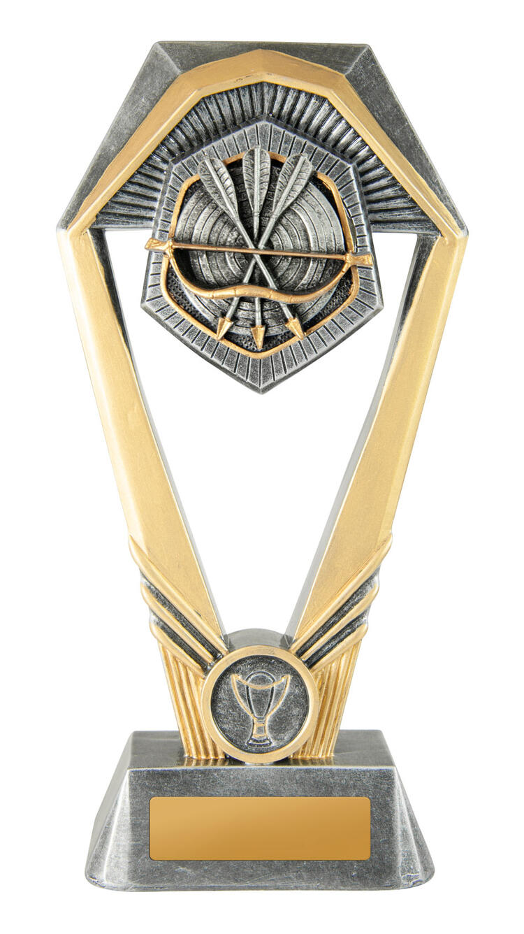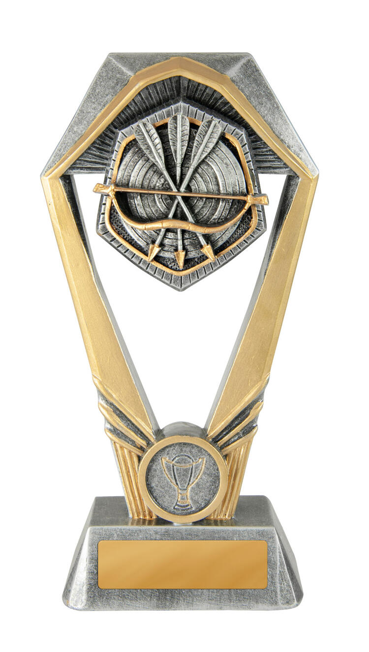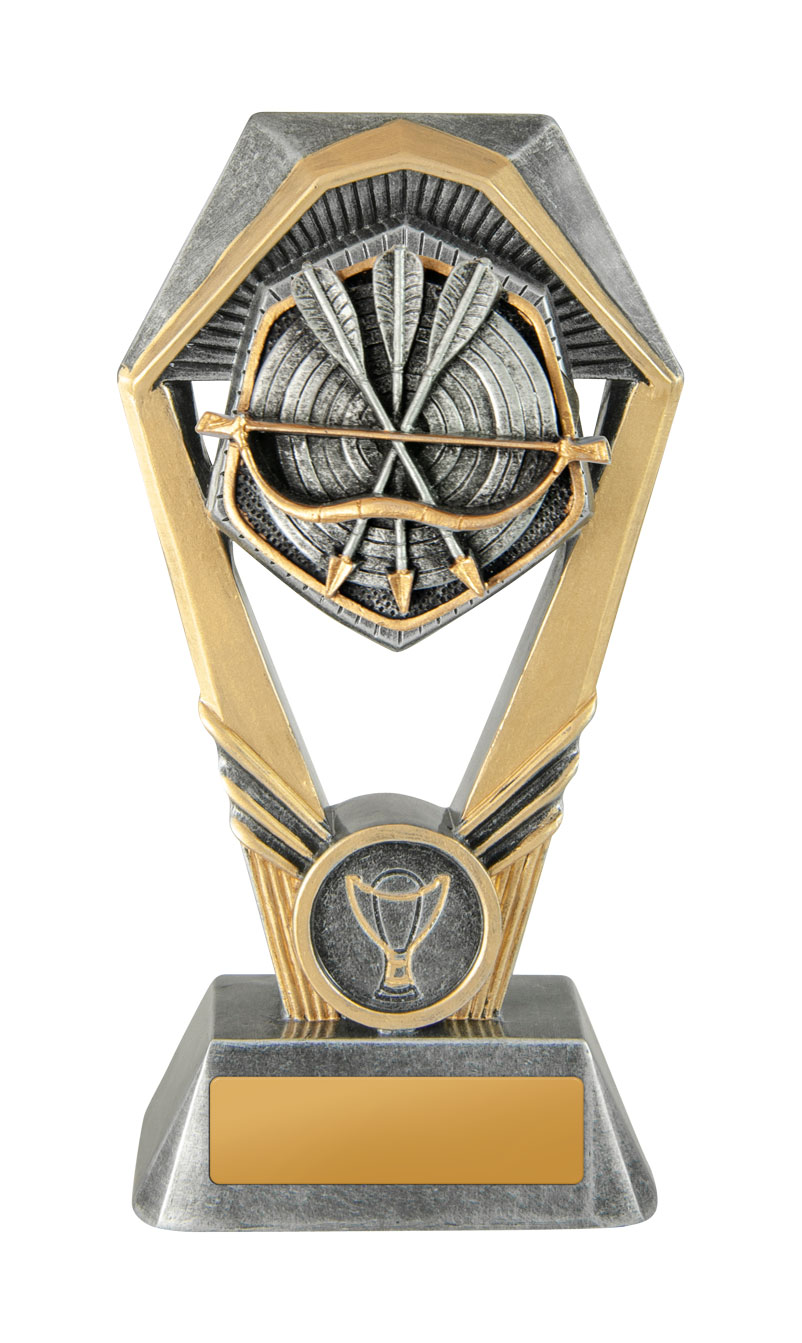 Showcasing a striking pentagonal frame in gold and silver tones, this shooting trophy is crafted from resin for lasting recognition. The design captures the spirit of shooting. Ideal for celebrating precision and achievement in archery competitions or events.