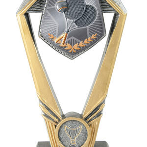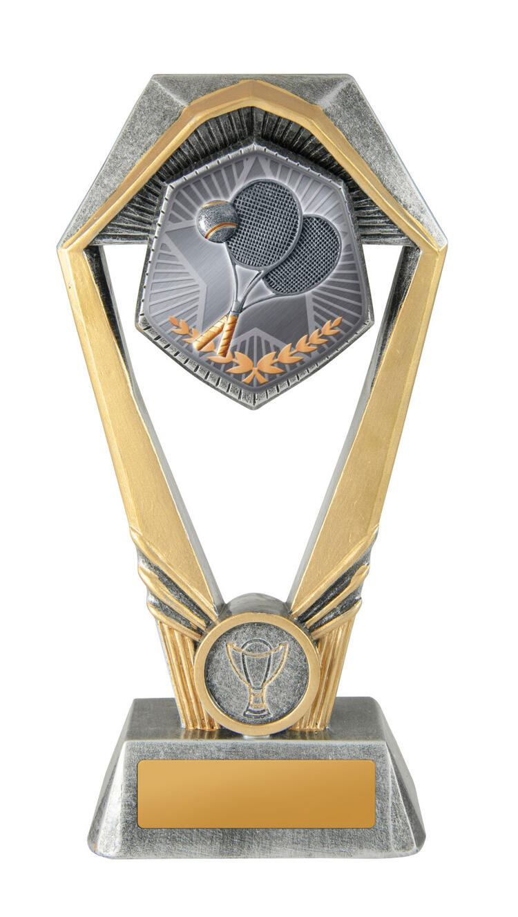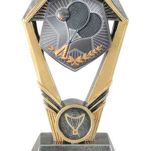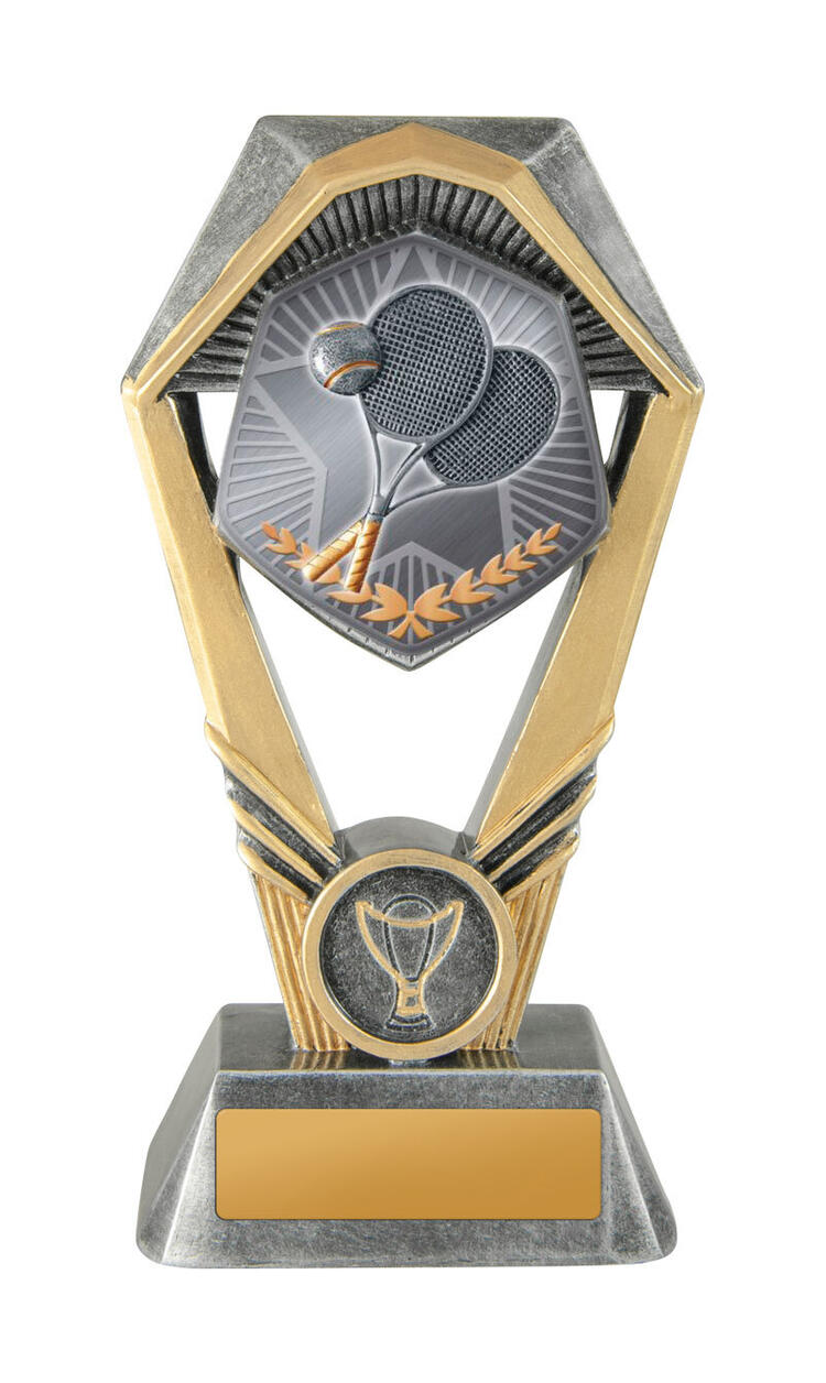 Striking a balance between modern design and sporting tradition, this tennis trophy features a distinctive hexagonal top and rectangular base, crafted from resin. Showcasing detailed tennis rackets and a ball in gold and silver, it offers a celebratory way to honour achievement. A blank plaque is included for custom personalisation.