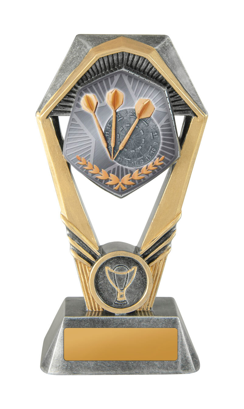 This darts trophy features a distinctive hexagonal top with a detailed dartboard and darts design, set above a rectangular base. Crafted from resin in elegant gold and silver tones, it creates a professional and memorable impression. The laurel wreath motif celebrates achievement, while the blank plaque allows for personalisation, making it ideal for darts events and competitions.