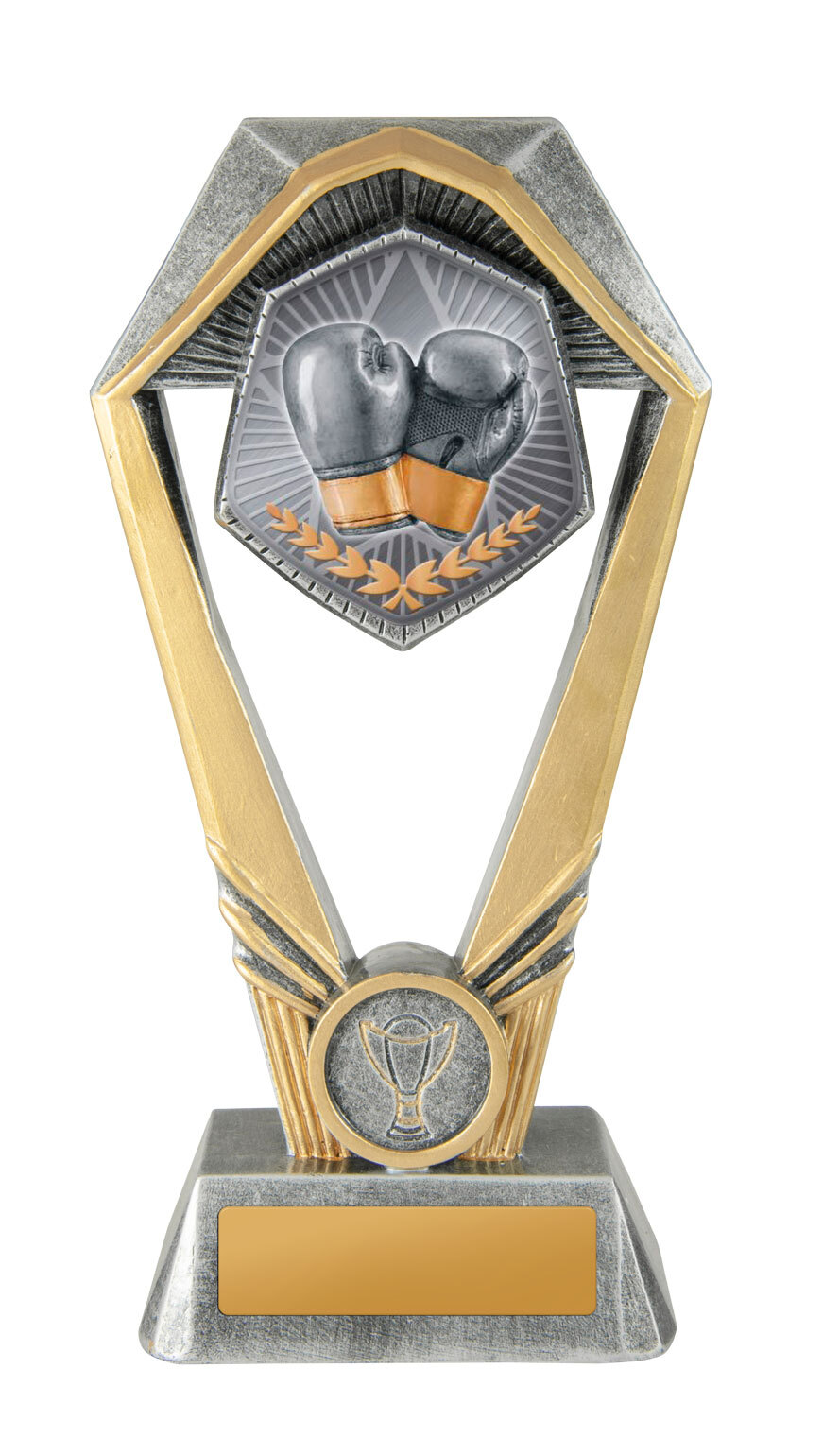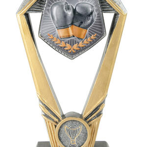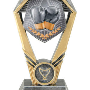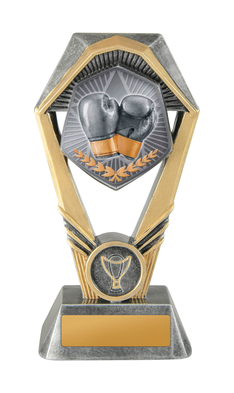 Distinctive and robust, this boxing trophy features a hexagonal top and rectangular base, creating a contemporary presence. The central boxing gloves and laurel wreath design captures the competitive spirit and dedication required in the sport. This award is crafted for lasting recognition at every level of achievement.