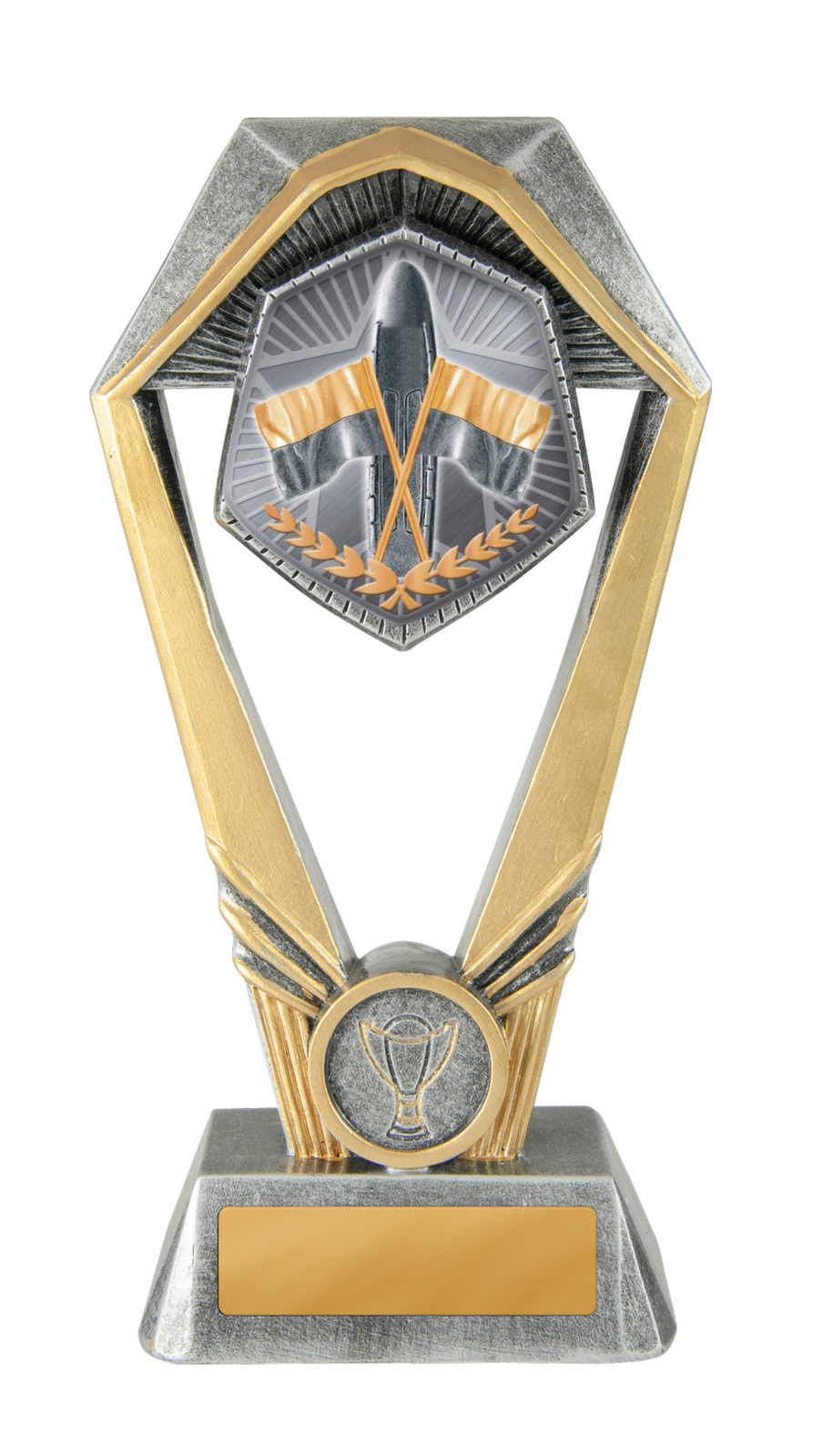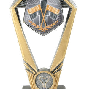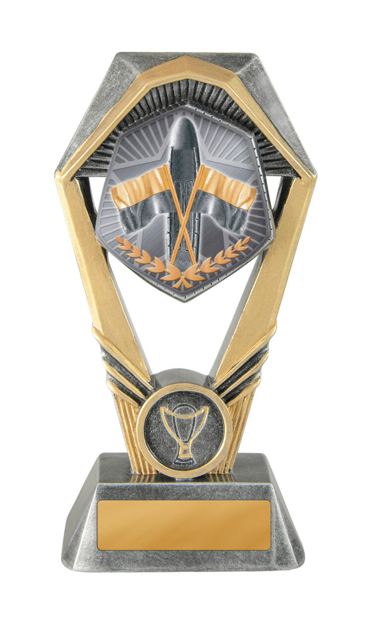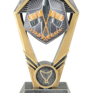 This surf lifesaving trophy stands out with its distinctive hexagonal top, mounted on a sturdy rectangular base for a modern finish. It features a detailed emblem of crossed flags and a laurel wreath, symbolising achievement and dedication.