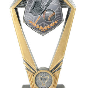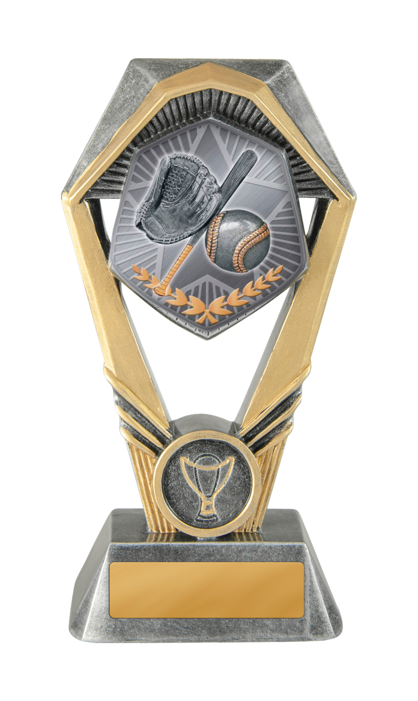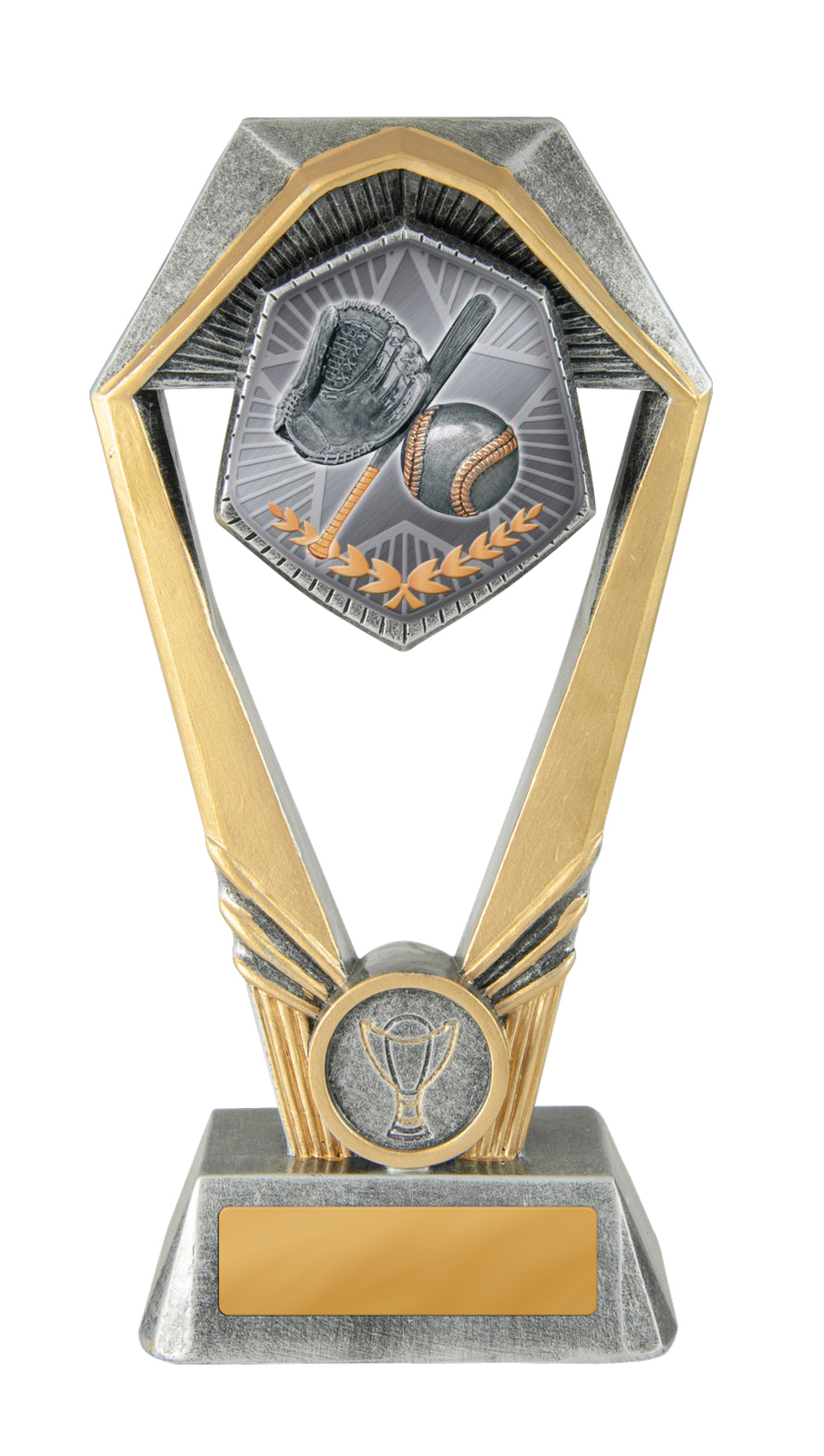 A contemporary baseball trophy designed to honour both individual and team achievements. This trophy features a striking hexagonal emblem displaying a baseball, bat, and glove motif, finished in a blend of gold and silver for a sophisticated look.