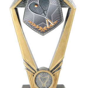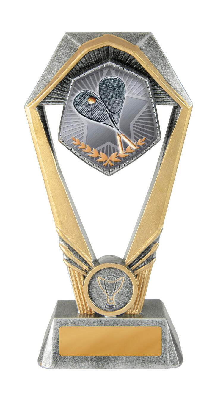 Crafted for distinction, this squash trophy features a striking hexagonal top with a rectangular base in elegant gold and silver tones. The detailed design showcases two squash rackets, a ball, and a laurel wreath, creating a celebratory symbol of sporting achievement.