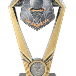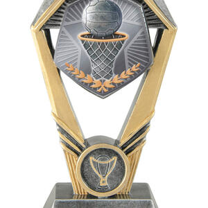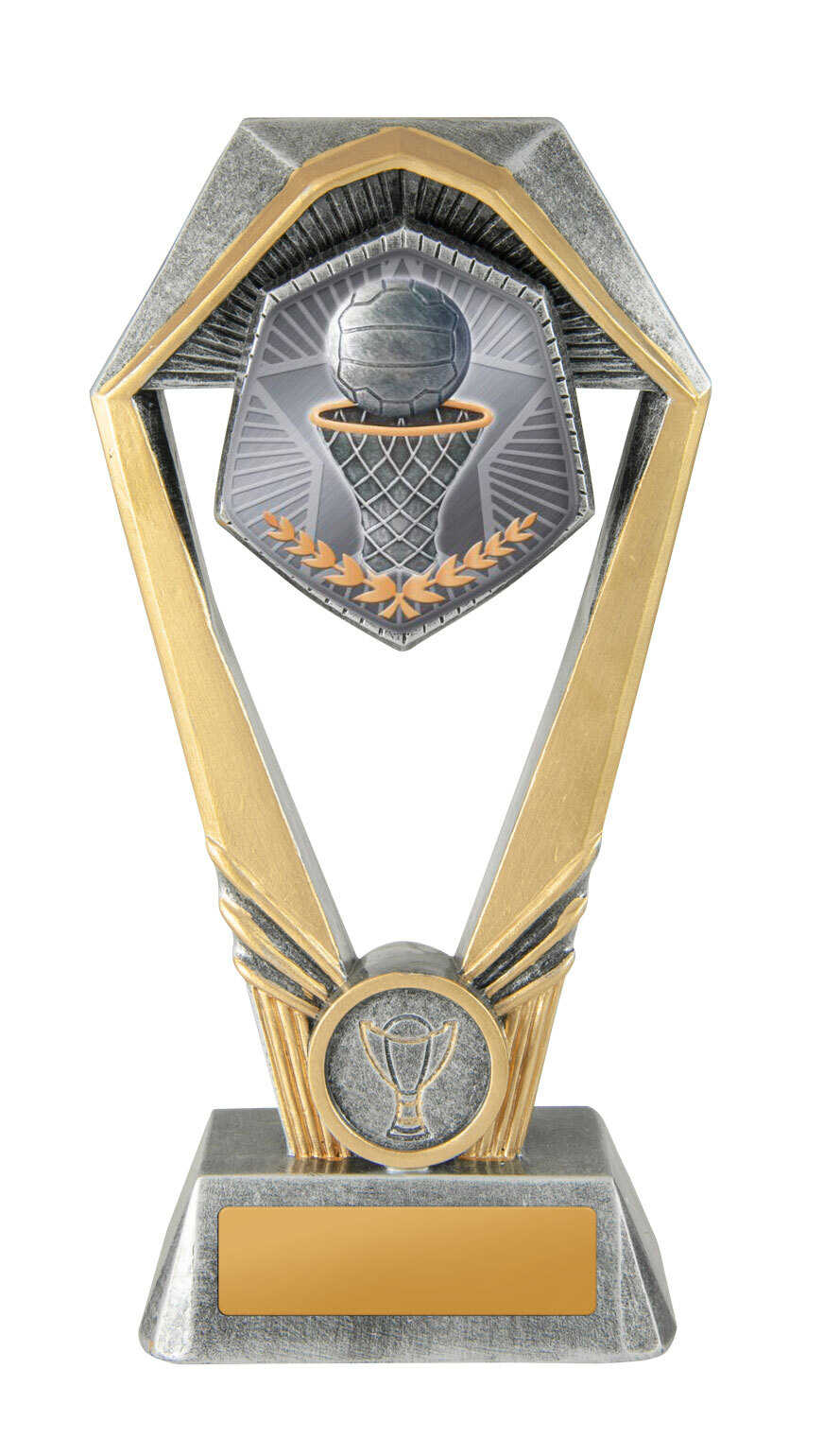 This contemporary trophy showcases a bold hexagonal top with a detailed netball design, complemented by a hoop and laurel wreath accent. Finished in an elegant blend of gold and silver, it features a robust rectangular base for a professional presentation. An ideal choice for netball trophy awards, it combines precision craftsmanship with a modern aesthetic.