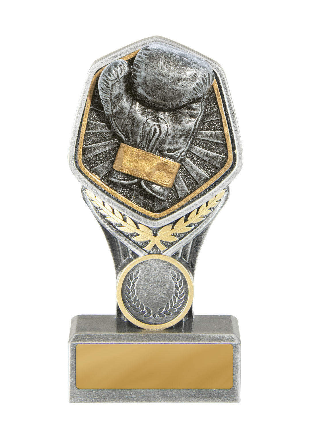 Contemporary boxing trophy with angular lines and modern detailing. Featuring metallic boxing gloves on a geometric frame, itÂ’s designed to stand out at any boxing event or awards ceremony.