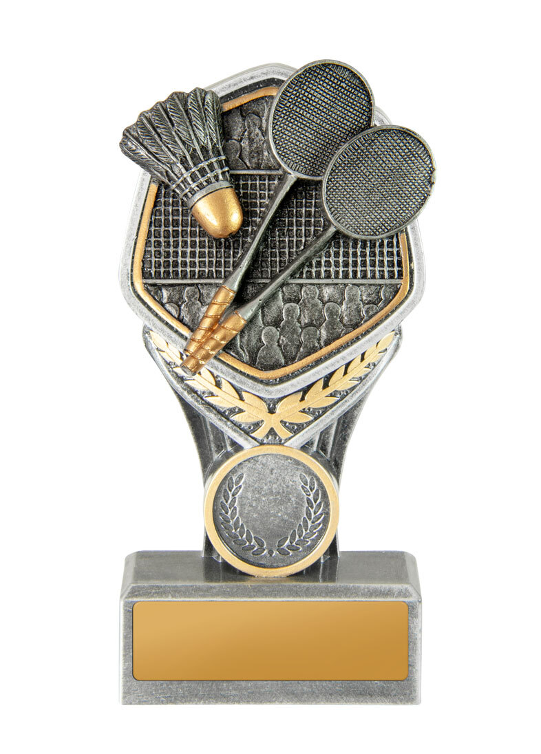 Stylish resin badminton award with detailed racquet and shuttlecock design. Silver finish with gold highlights for a premium look. A great choice for both juniors and senior players.