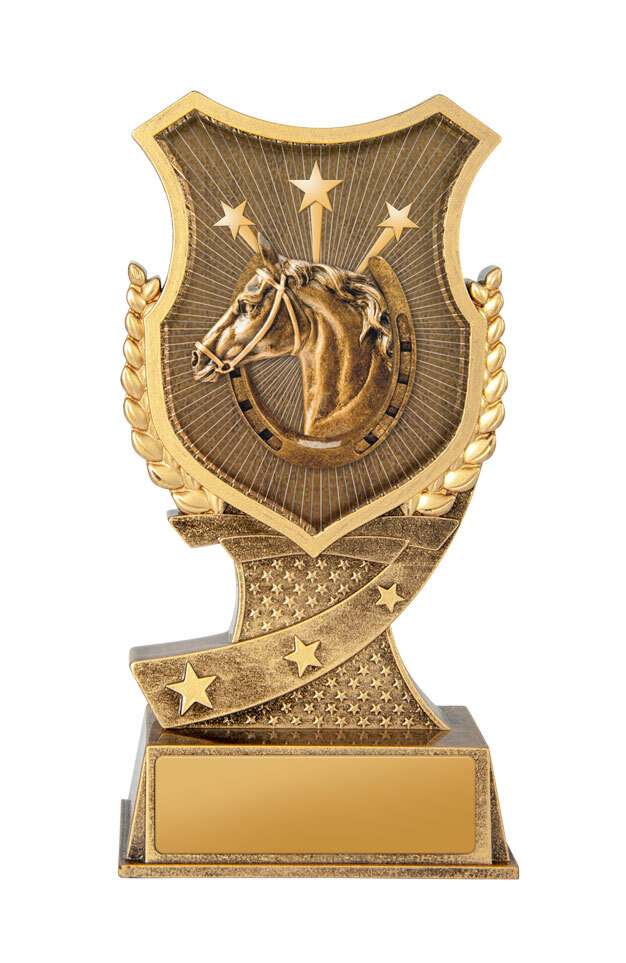 This striking trophy showcases a sculpted horse head inside a shield-shaped panel, framed with laurel leaves and highlighted by rising stars. Cast in antique gold resin, the design delivers a bold and prestigious look suited to champion awards, top rider trophies, best presented horse and other premium equestrian categories. The star-patterned base creates a strong visual foundation for personalised engraving.