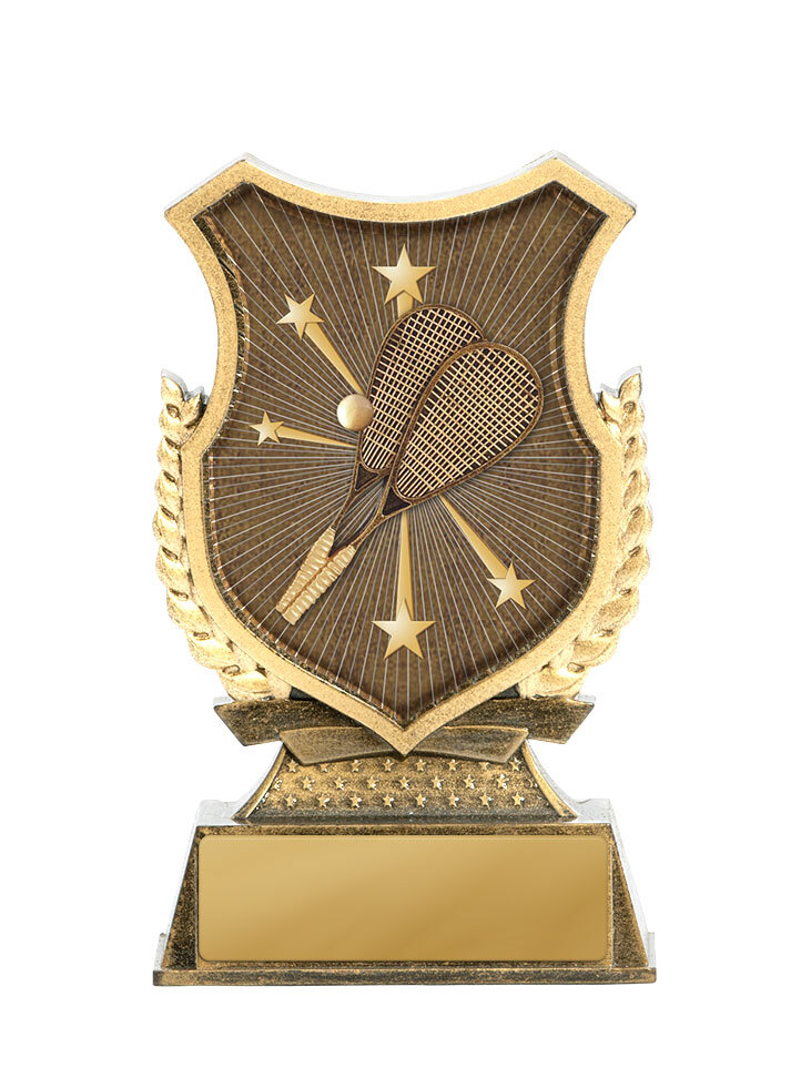 This squash trophy features crossed racquets and ball with gold laurel accents. Designed in antique silver and gold resin, its a stylish and durable choice for recognising excellence in squash.