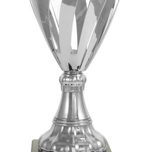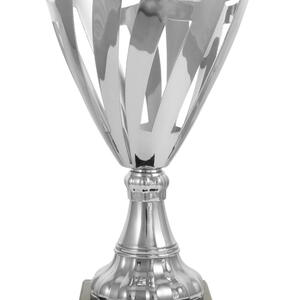 A contemporary silver trophy cup with a striking flared top, this award features precision crafted cut out patterns and a sturdy rectangular base. The interplay of refined silver metal and deep black accents gives it a professional, elegant presence. A trusted choice for recognising achievement in corporate, academic, or community settings where quality and modern design are valued.