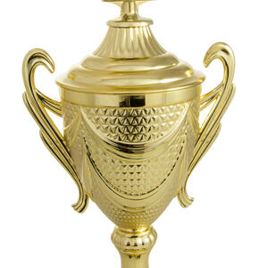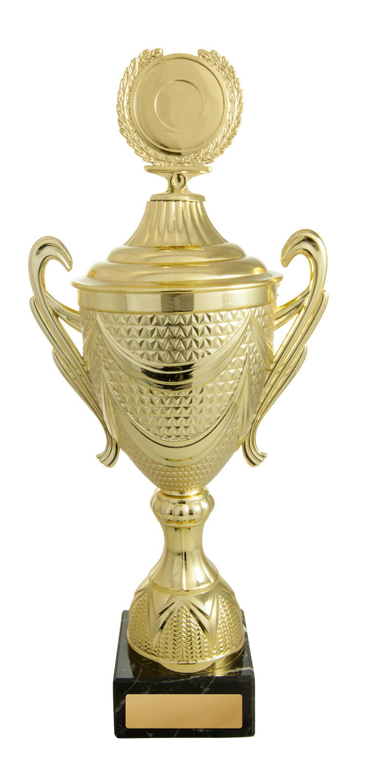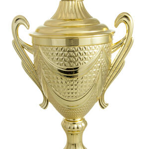 This gold trophy cup offers a timeless design featuring a round top with elegant handles and a decorative emblem, making it ideal for sports recognition. Crafted from metal and plastic, it stands on a black base with a gold plaque for personalisation. Its refined finish and classic silhouette make it a trusted choice for memorable awards presentations.