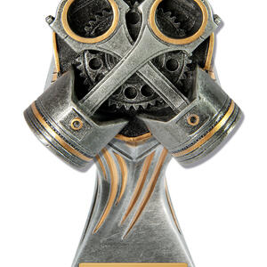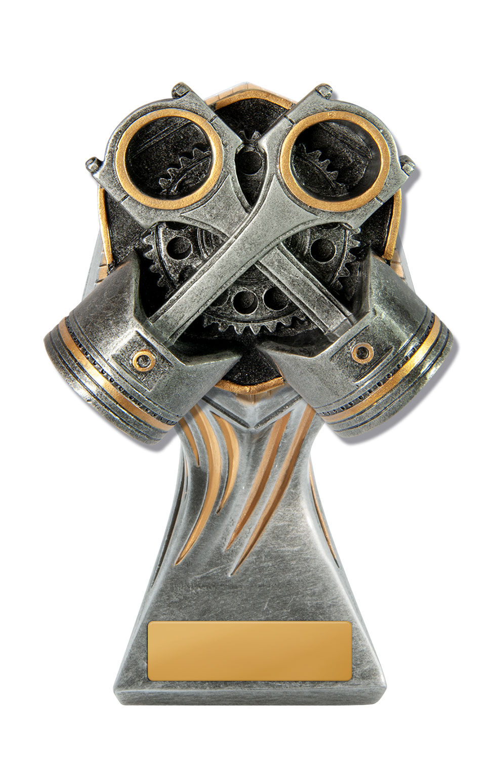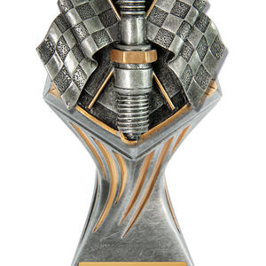 Crafted for distinction, this trophy features a commanding silver and gold finish, with a spark plug centrepiece and checkered flags that capture the essence of motorsport achievement. The bold, trophy like form is designed for those who value precision recognition in motorsport events. Perfect for organisers seeking motorsport trophies that are both elegant and memorable.