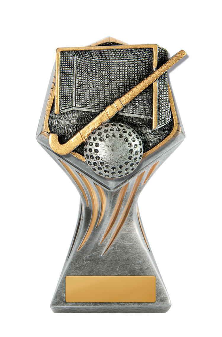 This hockey trophy presents a bold hexagonal top and a refined silver and gold finish, crafted in resin for a lasting impression. Featuring a dynamic hockey stick, ball, and goal design, it encapsulates the spirit of the sport with precision detail.