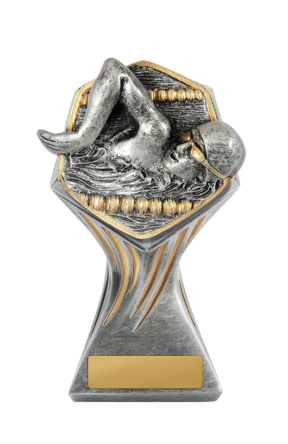 Celebrate outstanding swimming achievements with this elegant swimming trophy from the Gladiator Series. Featuring a male swimmer in a dynamic backstroke pose, it is crafted from resin with a silver and gold finish. Available in a range of sizes, each trophy includes a base, a 3D prestige insert, and a gold plaque ready for personalisation.