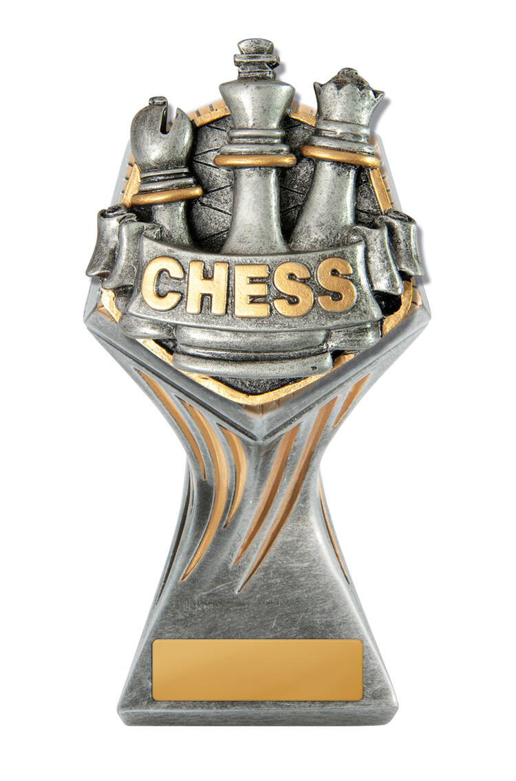 Celebrate strategic achievement with this chess trophy from the Gladiator Series. Crafted with a refined silver and gold metallic finish, it features a bold hexagonal top, a gracefully flared base, and detailed chess piece designs including the king, queen, and bishop. The prominent 'CHESS' detail and series sizing options make it an ideal choice for recognising excellence at any level of competition.