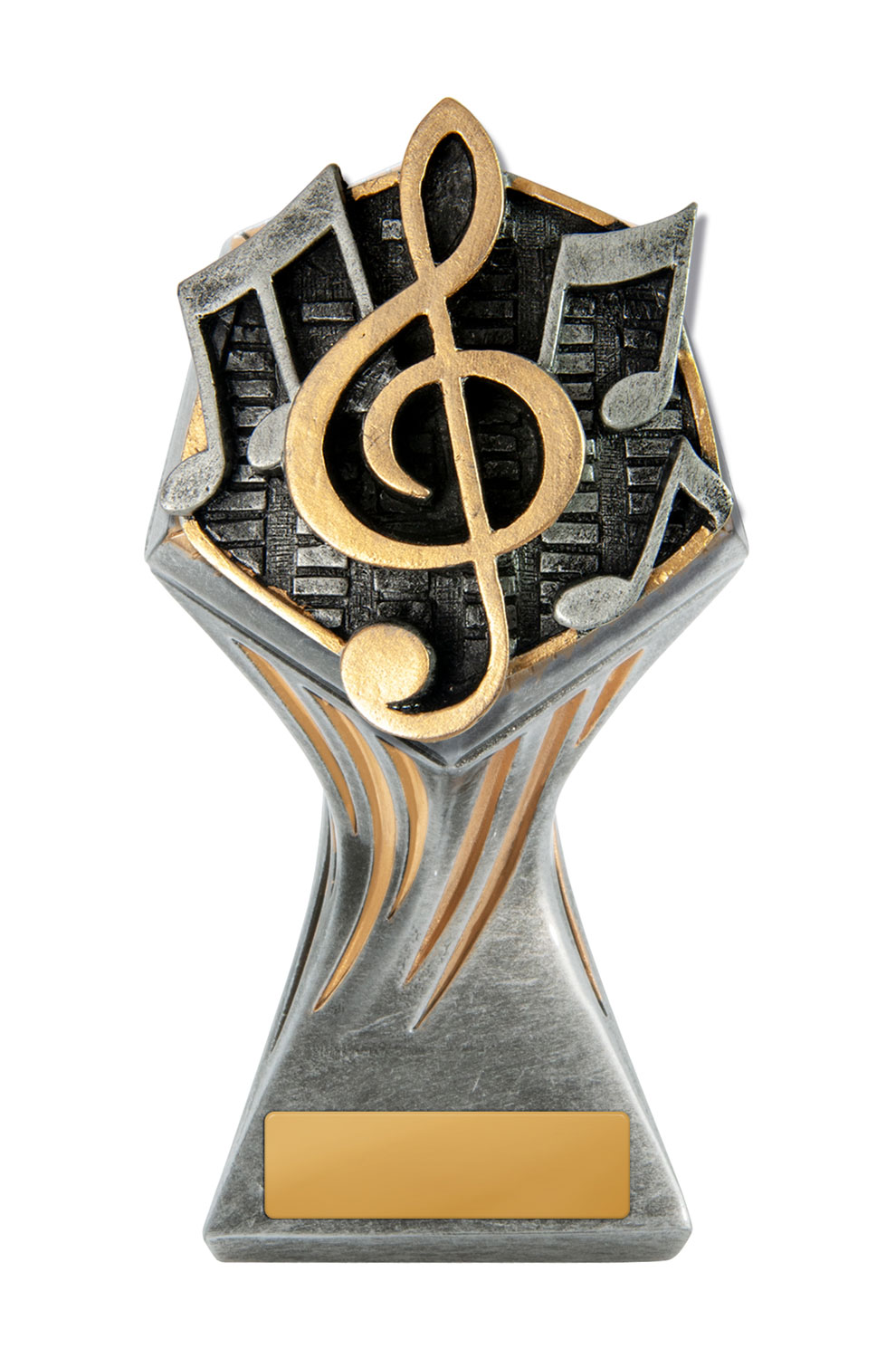 A striking tribute to eloquence and artistry, this public speaking trophy is crafted from durable resin and finished in gold and silver. The trophy's elegant design features a treble clef and musical notes, making it ideal for music and arts recognition. Its distinctive shape delivers a memorable and professional presentation at any awards event.
