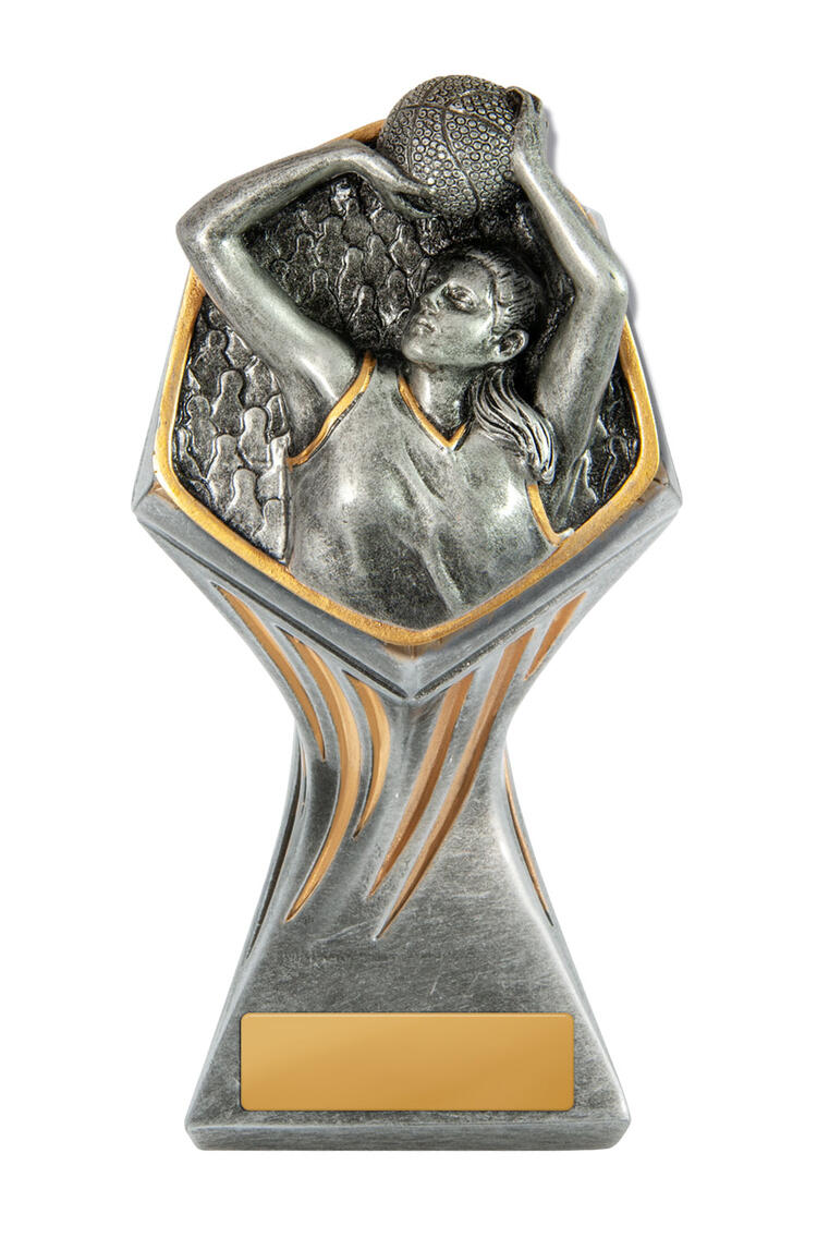 Celebrate excellence on the court with this basketball trophy from the Gladiator Series, designed to honour female players. Featuring a dynamic sculpted figure in motion, this award combines a striking silver and gold finish with a modern hexagonal top and flared base. Crafted for durability and available in a range of sizes, it offers a professional solution for memorable basketball recognition.