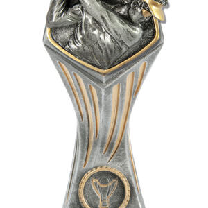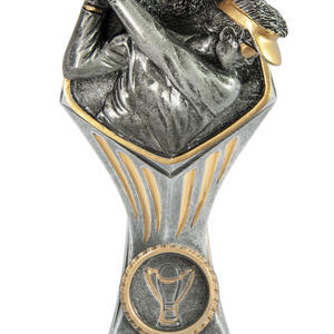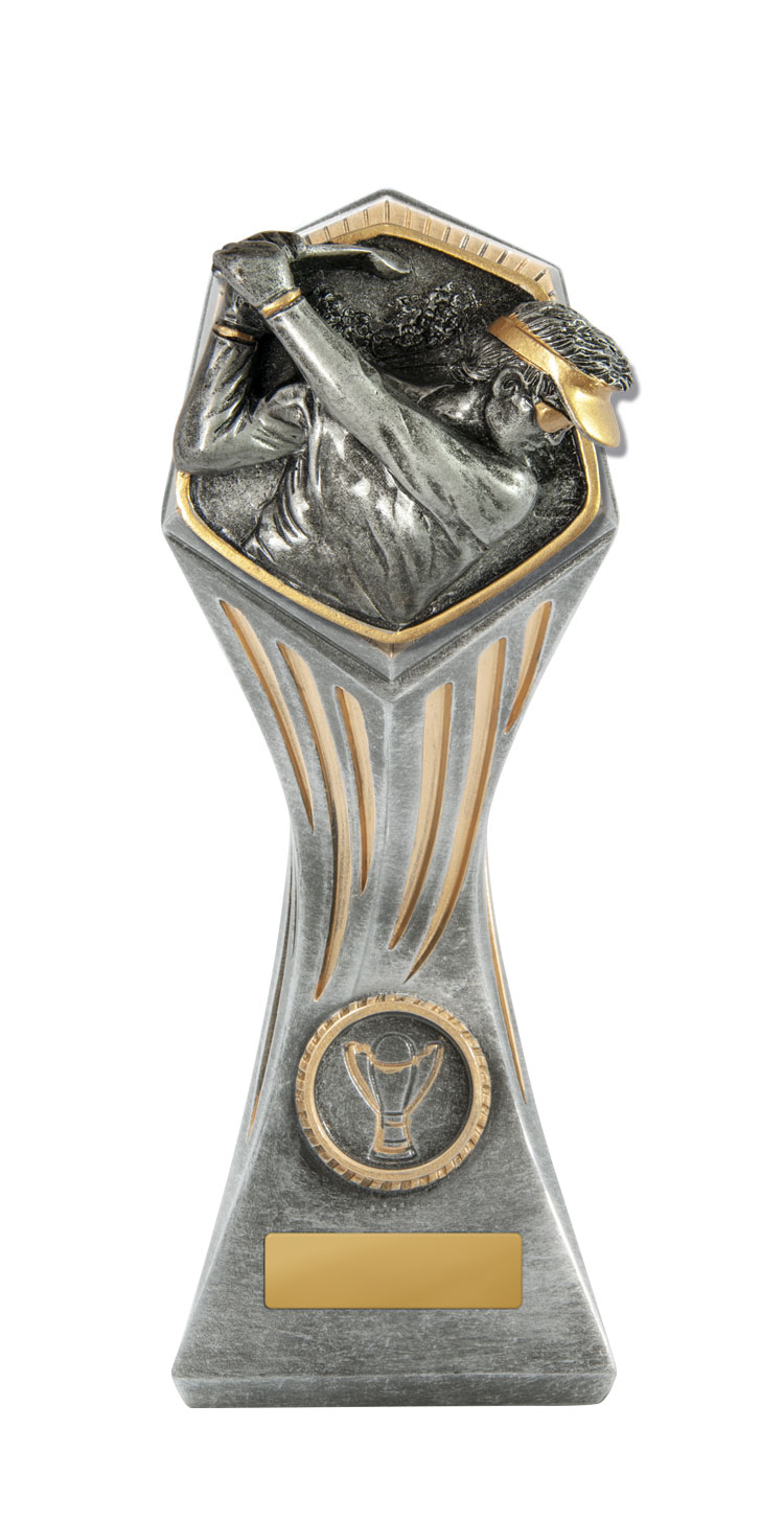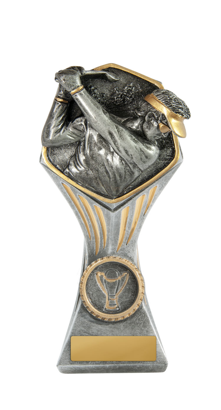 This golf trophy from the Gladiator Series blends precision craftsmanship with a refined modern design. Featuring a striking hexagonal top and a stable triangular base, it showcases a golfer in full swing, crafted in silver and gold resin finishes. The trophy emblem at the base completes its professional look, making it an ideal recognition piece for golf achievements at any level.