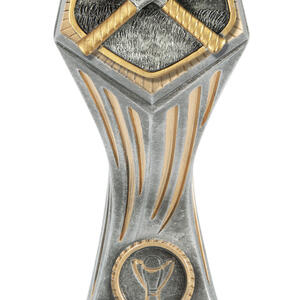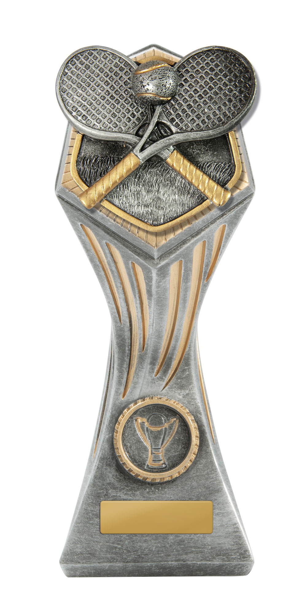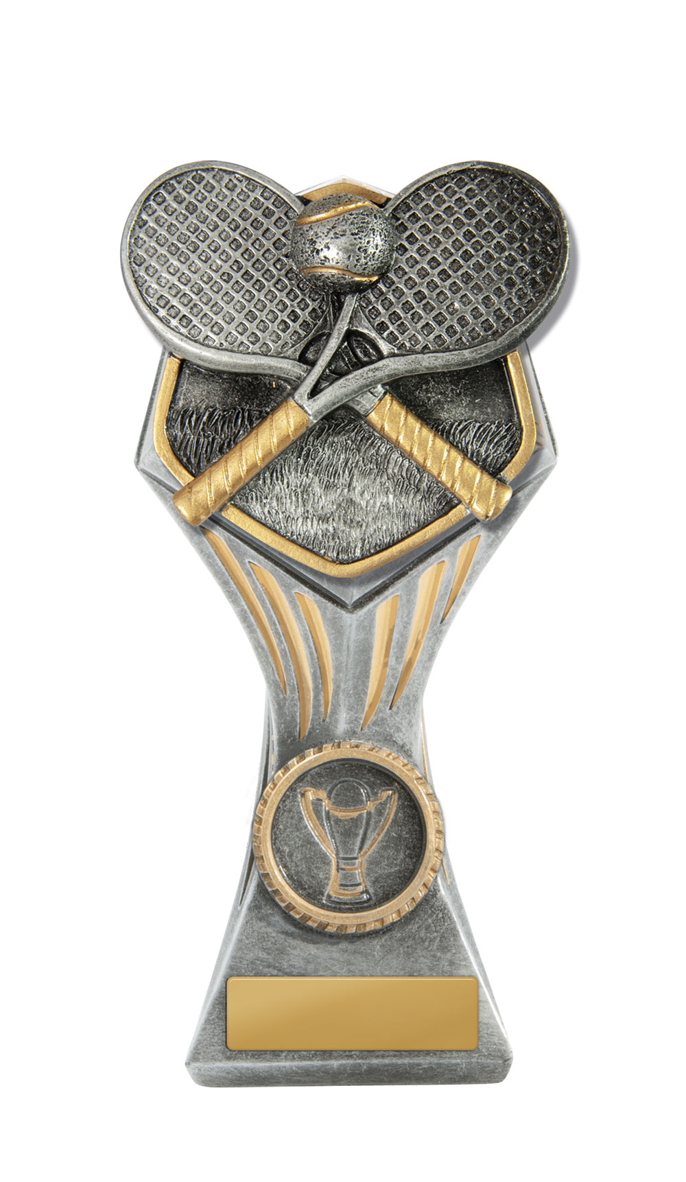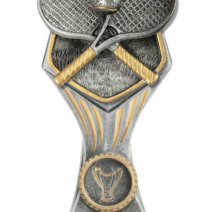 Distinctive and modern, this table tennis trophy from the Gladiator Series showcases crossed paddles and a ball set against a hexagonal silver and gold backdrop. Crafted in durable resin with a refined painted finish, it stands 150mm tall. The flared base features a trophy emblem and a space for a custom club insert, offering a professional and memorable recognition solution for table tennis excellence.