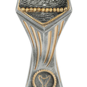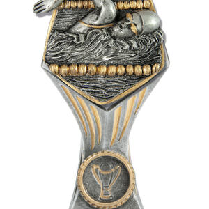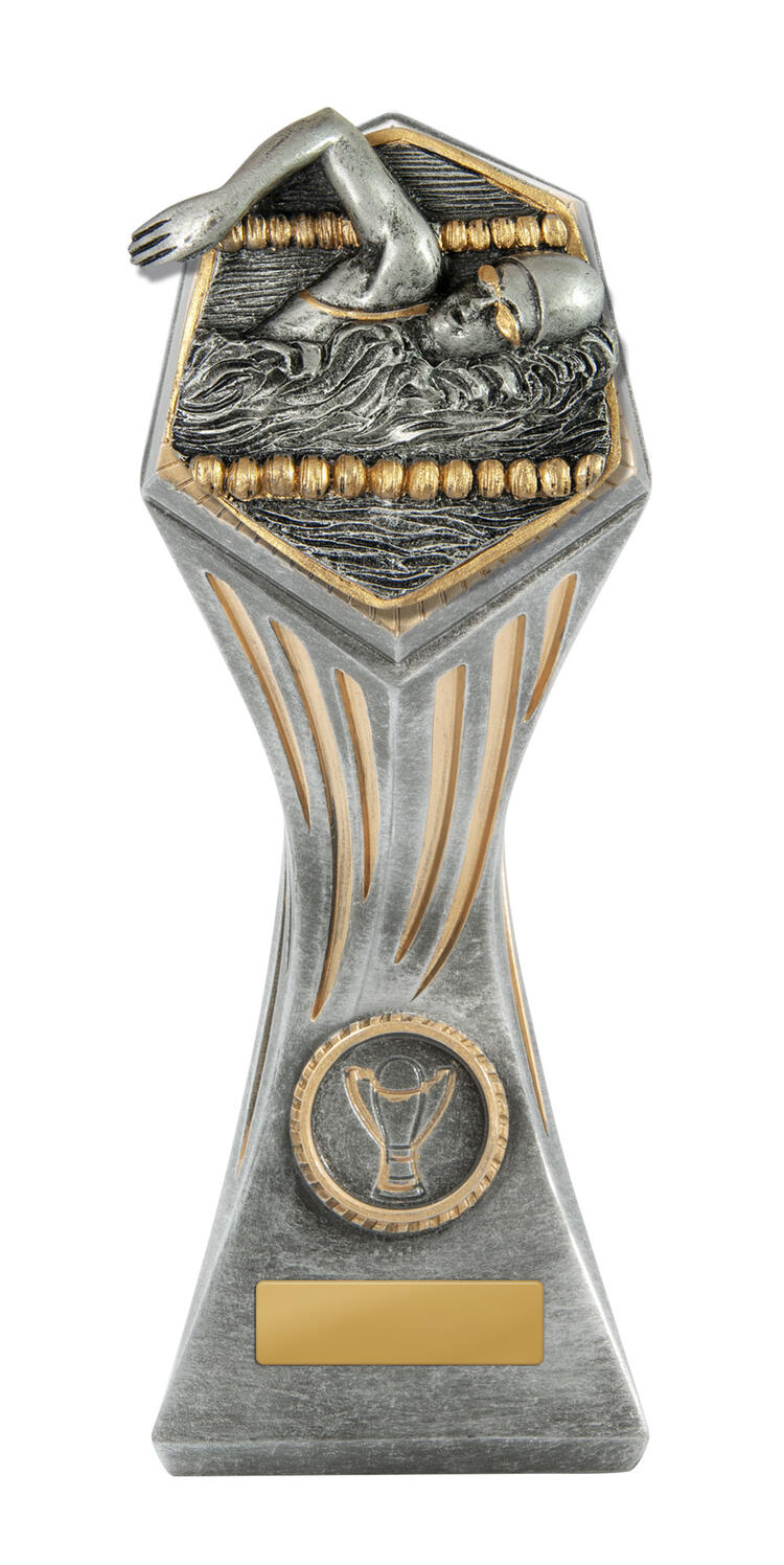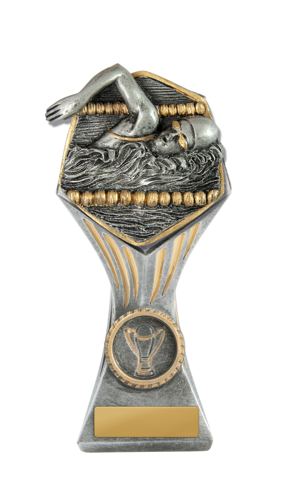 This swimming trophy from the Gladiator Series features a striking female swimmer in freestyle form, set atop a distinctive hexagonal platform. Crafted in silver and gold tones, the resin construction with a sturdy base offers both durability and elegance. Finished with a trophy emblem on the base, it's ideal for recognising dedication and achievement in swimming.