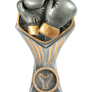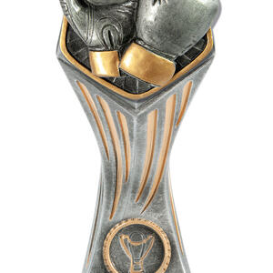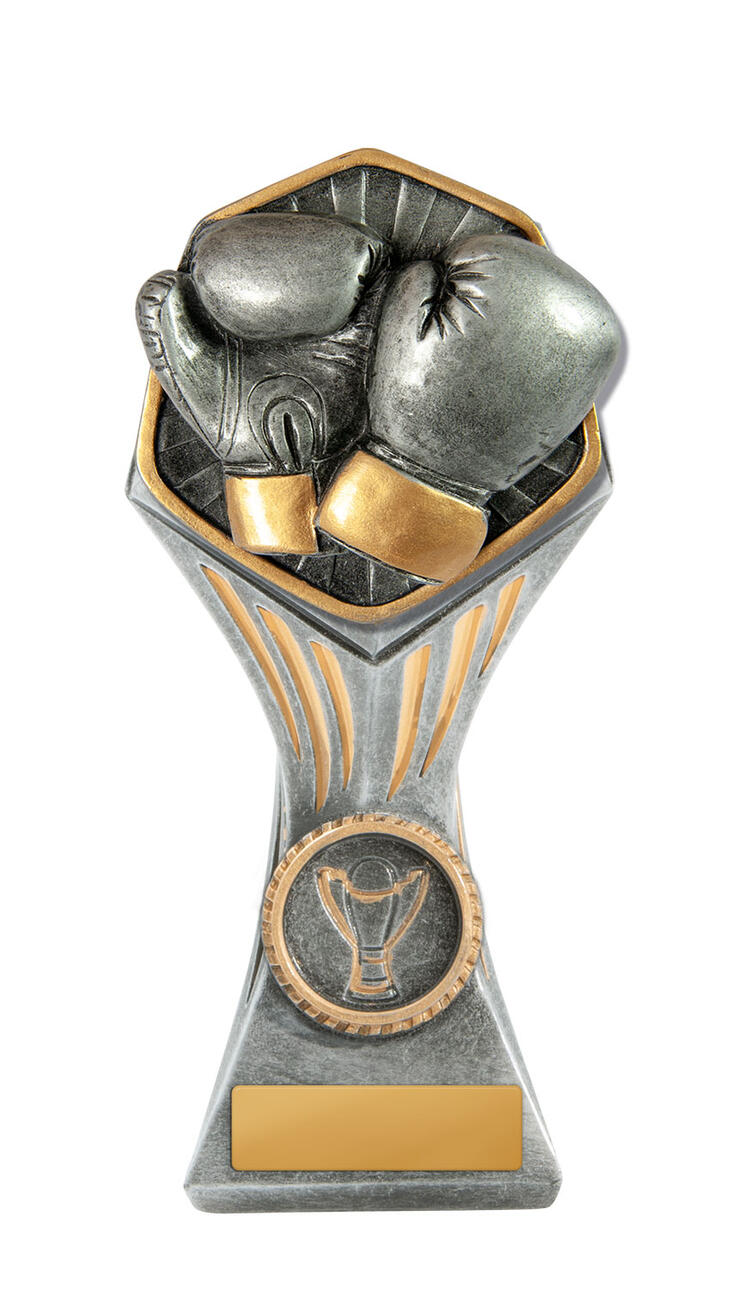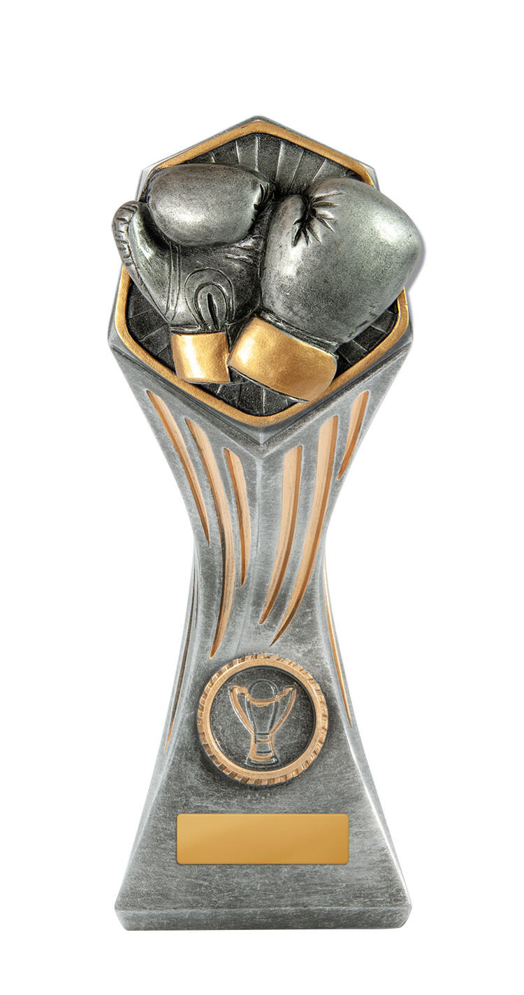 This Gladiator Tower stands out among boxing trophies with its bold pairing of silver and gold finishes and a striking hexagonal top. Crafted in robust resin, it showcases detailed boxing gloves at the centre, complemented by a classic trophy emblem at the base. Available in a range of sizes, this award provides a memorable way to recognise boxing achievement with quality and style.