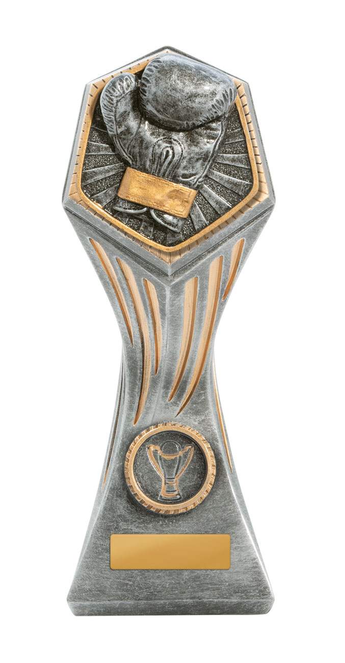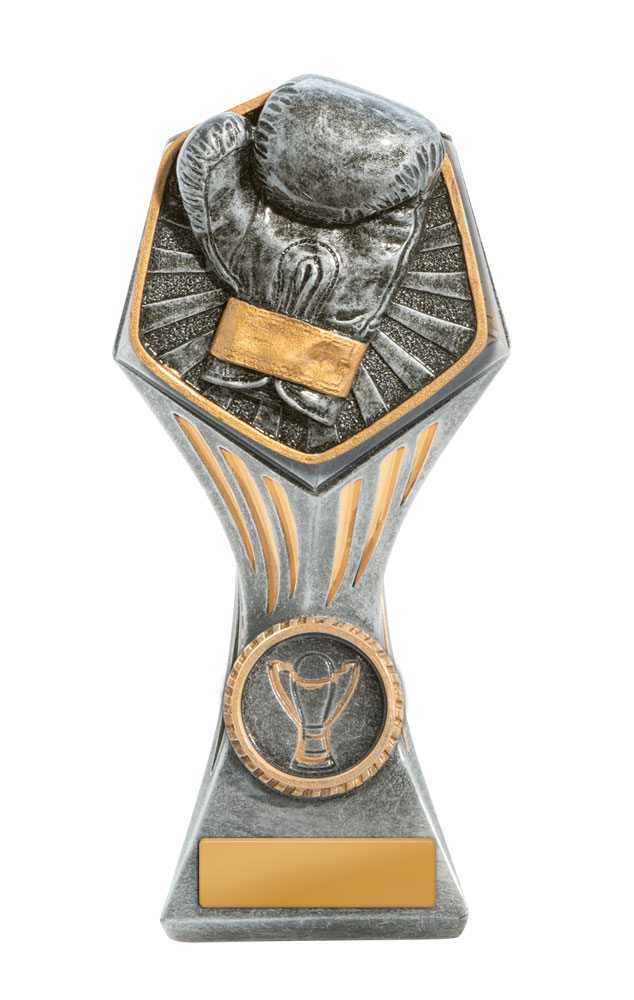 A bold addition to any collection of boxing trophies, this Gladiator Series award features a striking 3D boxing glove design atop a hexagonal resin structure. Finished in refined silver and gold, the 150mm trophy is elevated by a flared base and a trophy emblem, offering a professional and durable recognition piece for standout achievement in the ring.