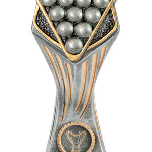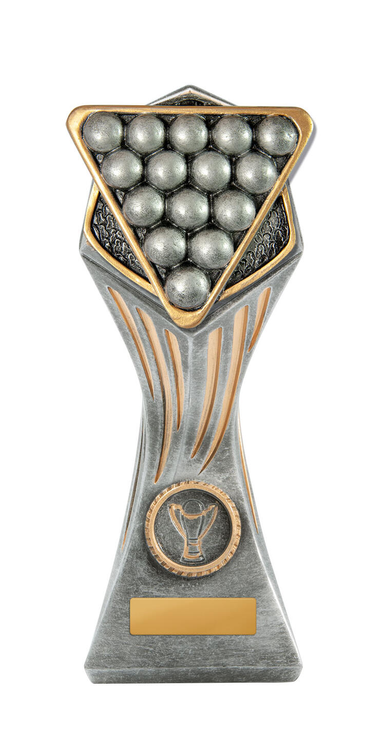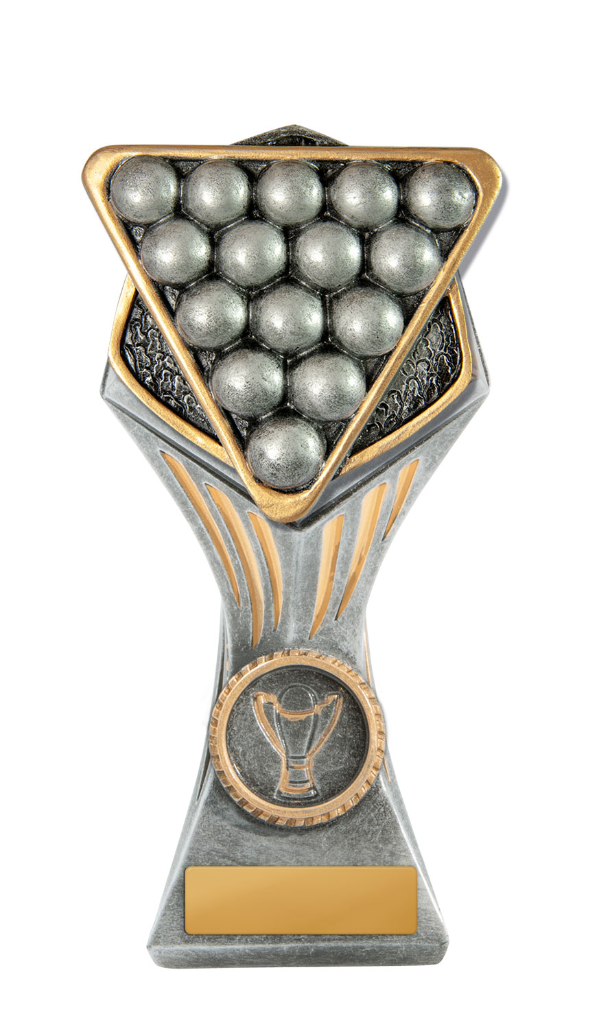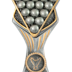 This snooker trophy delivers professional recognition with its striking triangular top, featuring a detailed arrangement of billiards balls that symbolise the sport's essence. Crafted in durable resin and finished in elegant silver and gold, it stands on a solid rectangular base adorned with a trophy emblem. An ideal choice for cue sports celebrations in clubs, schools, and tournaments.