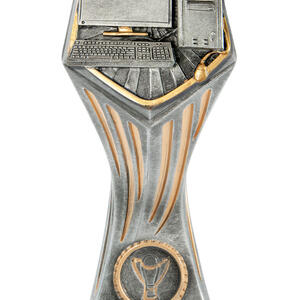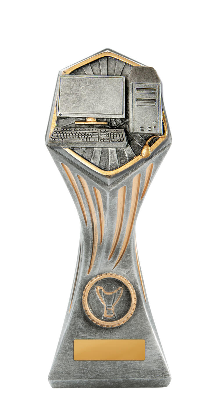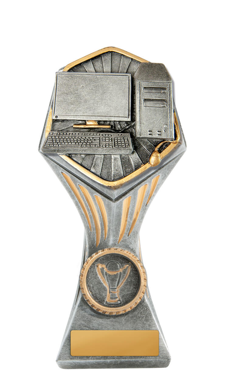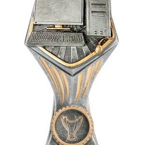 Blending refined metallic tones with innovative design, this trophy stands out among computer trophies for esports and technology events. The hexagonal top displays a detailed computer setup; monitor, keyboard, and CPU, capturing achievement in the digital sphere. Its sleek silver and gold finish, crafted in durable resin, makes it an elegant and memorable choice for recognising excellence in technology focused competitions.