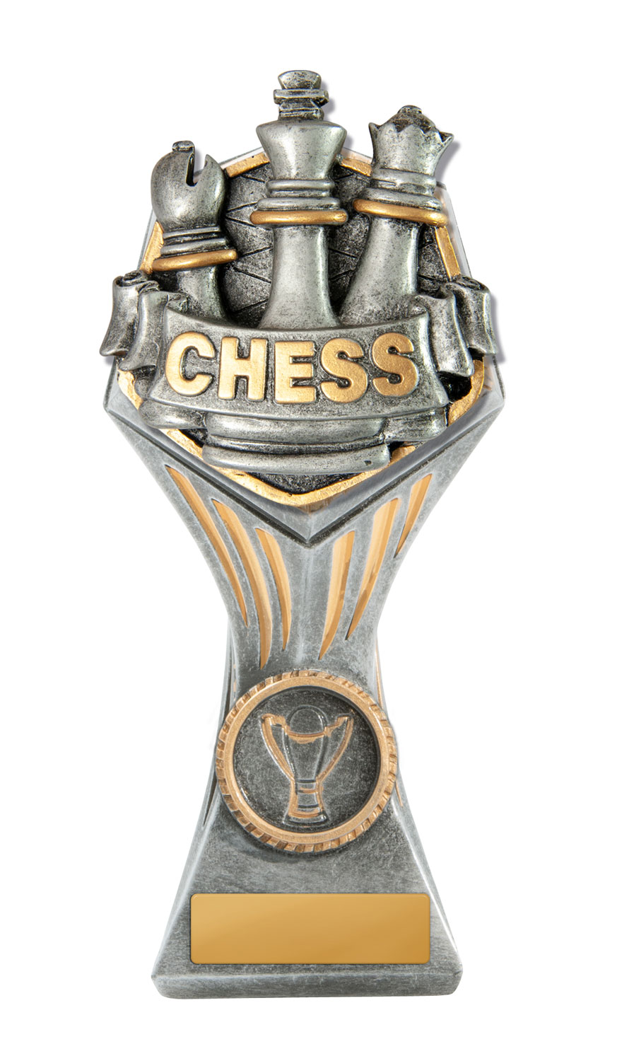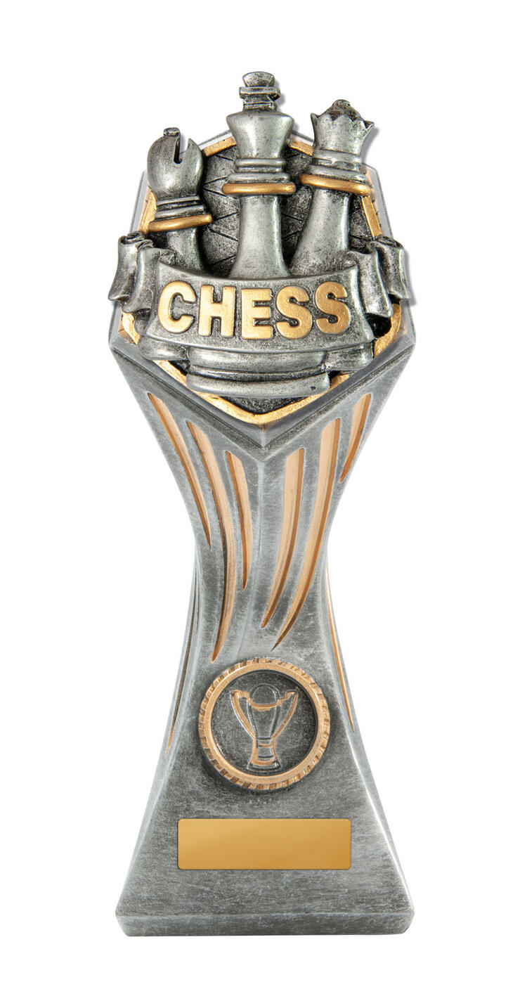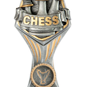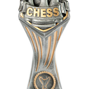 Crafted for excellence, this Gladiator Series chess trophy features a sleek silver and gold finish with a robust base. Distinct chess pieces;the king, queen, and bishop, are showcased atop, with the word 'CHESS' highlighted for a professional touch. Ideal for recognising strategic achievement, this durable piece brings prestige to chess trophies and memorable tournaments.