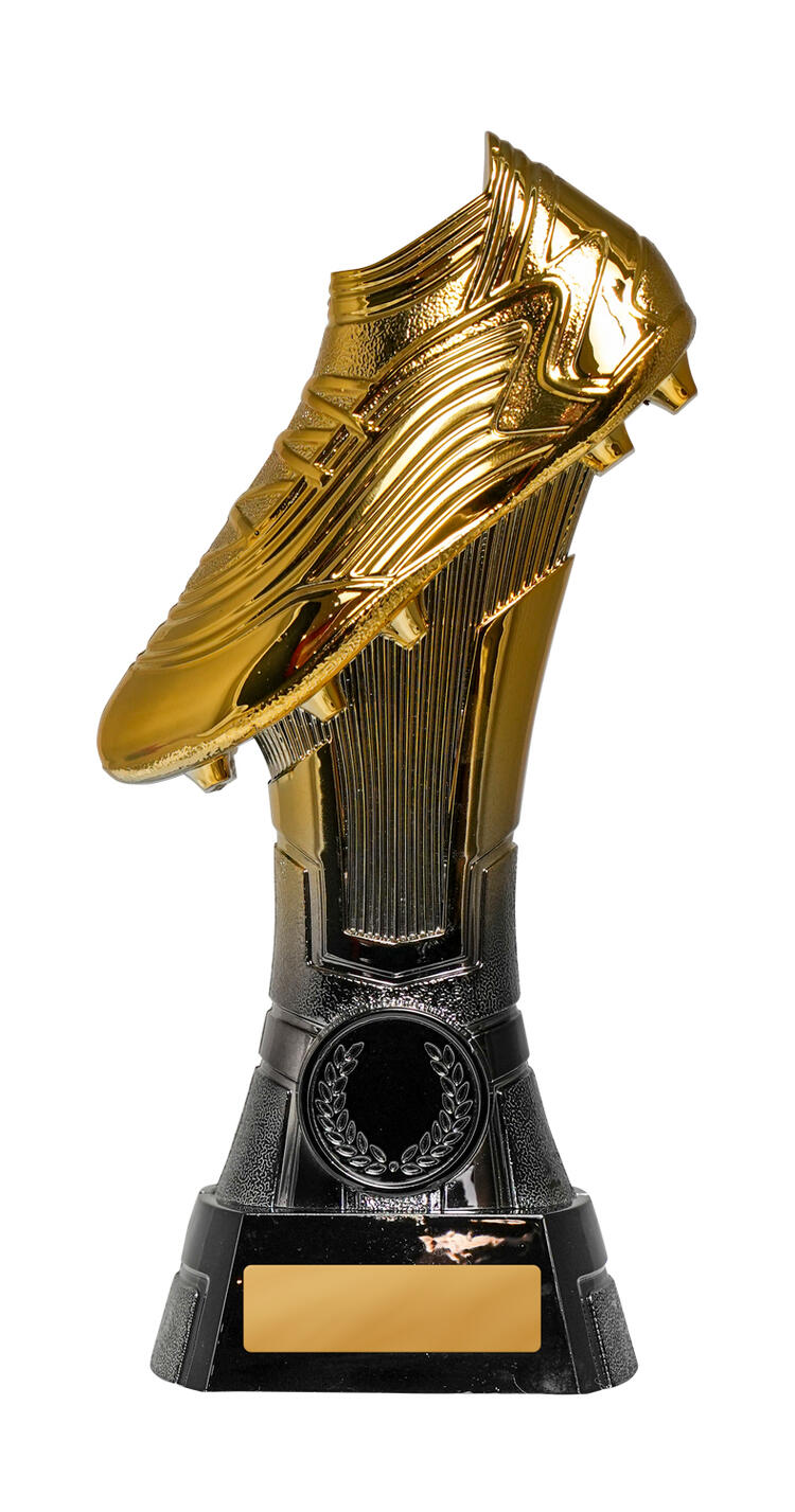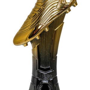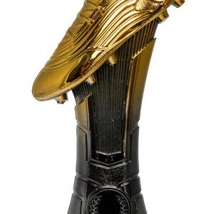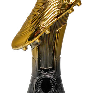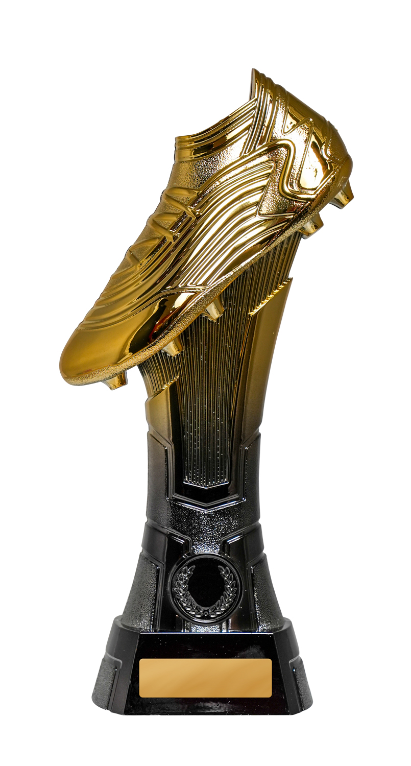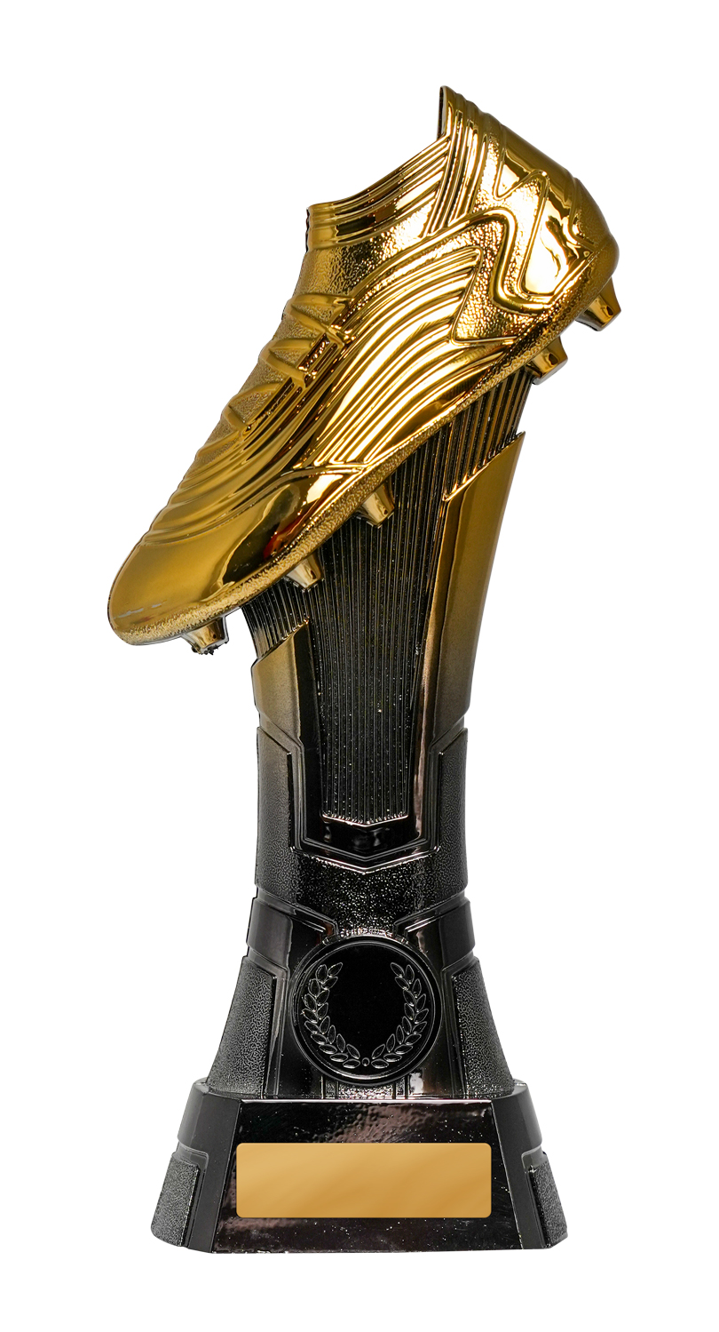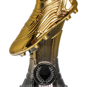 Showcasing a dynamic football player mid kick, this MEGASTAR series trophy captures the thrill of the game in a refined metallic finish. The design features gold and silver tones, a striking circular emblem, and a sturdy base enhanced with distinctive football patterns. An ideal choice for clubs or schools looking for soccer trophies that honour sporting achievement with lasting style.
