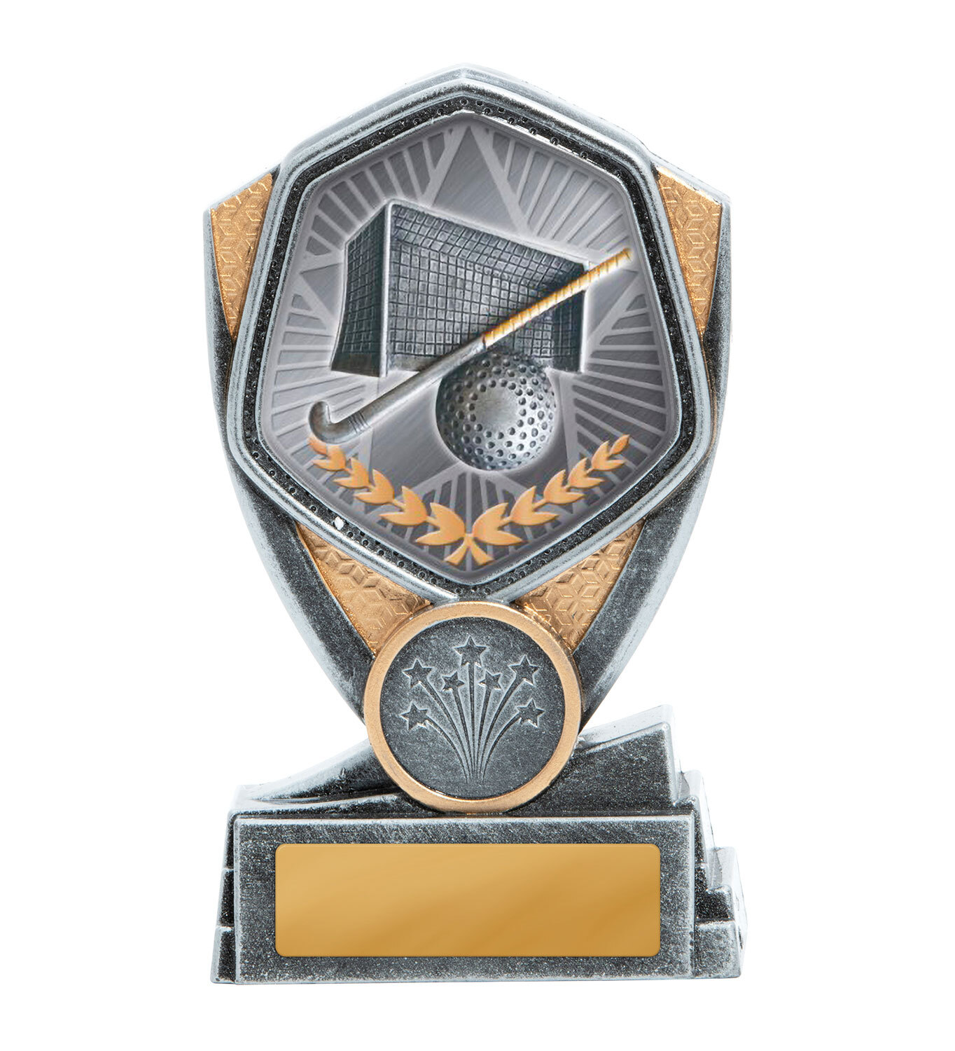 This classic hockey trophy showcases the essential elements of the game with its detailed stick, ball, and goal imagery. Crafted from durable resin with antique silver and gold tones, its perfect for rewarding skill and team spirit in hockey competitions.