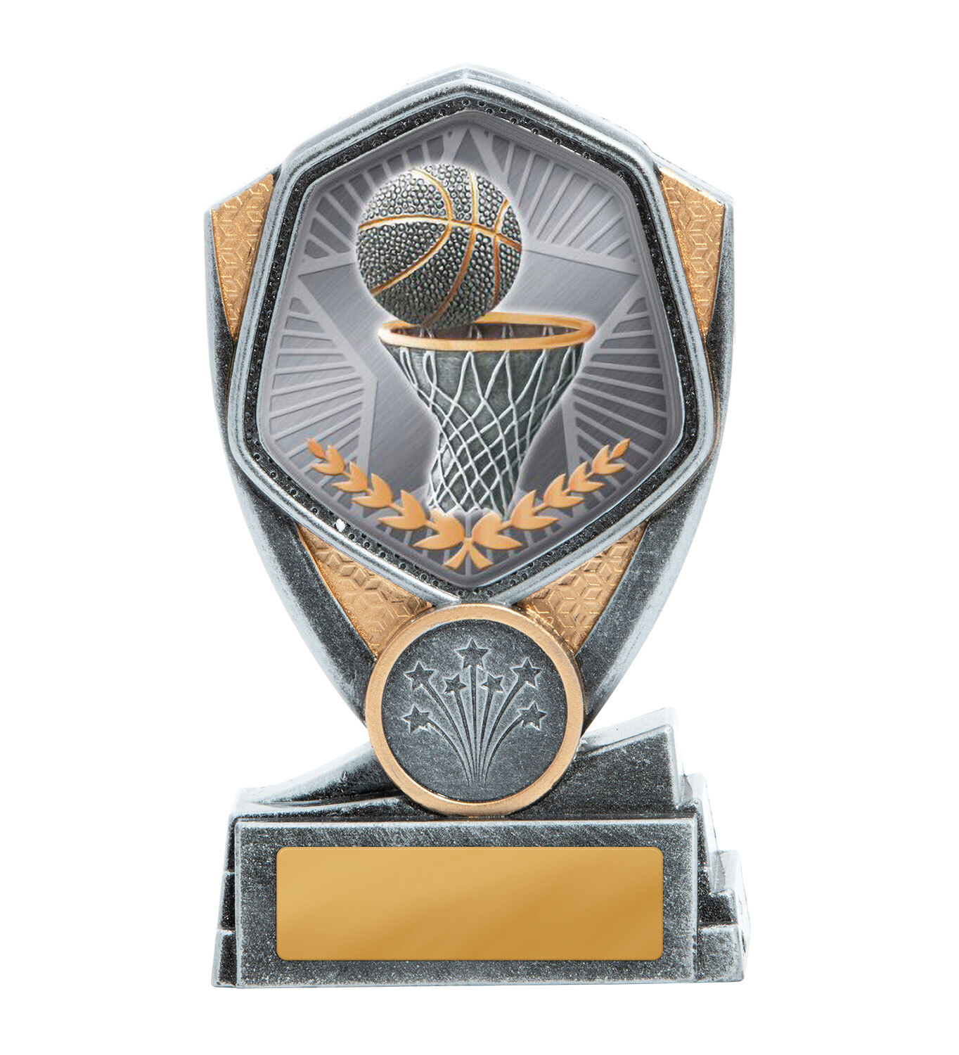 Silver and gold resin basketball trophy with modern shield style frame. The design features a textured background and hoop emblem, perfect for recognising basketball excellence and team achievement.