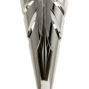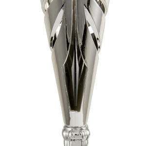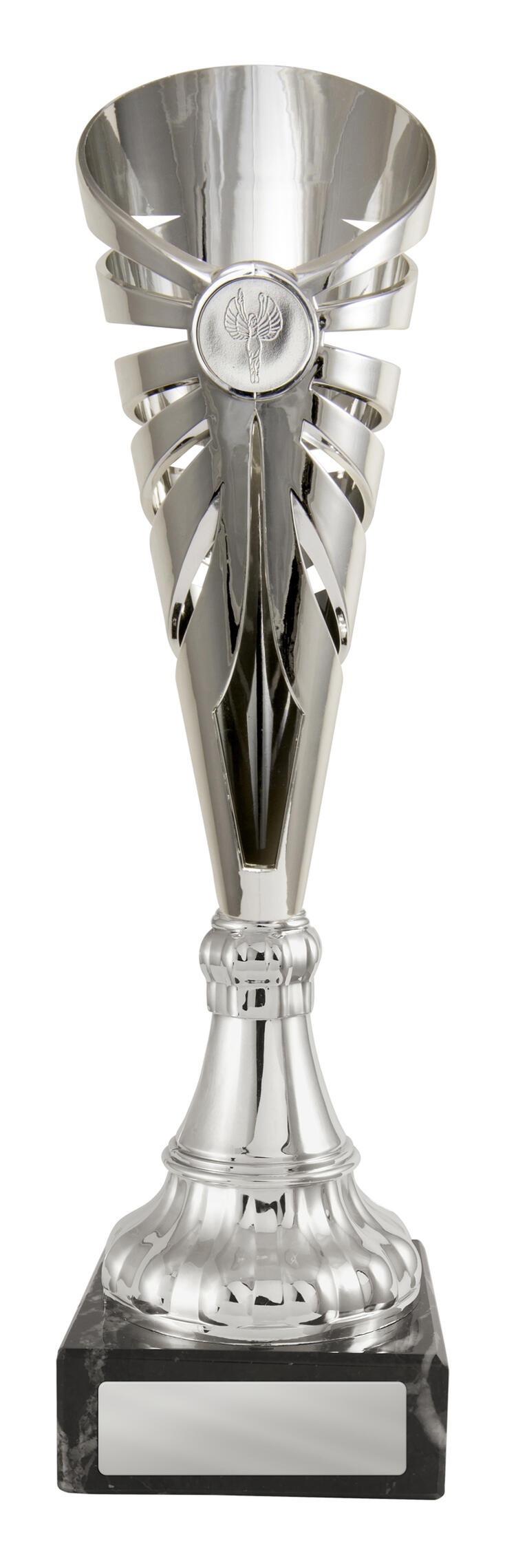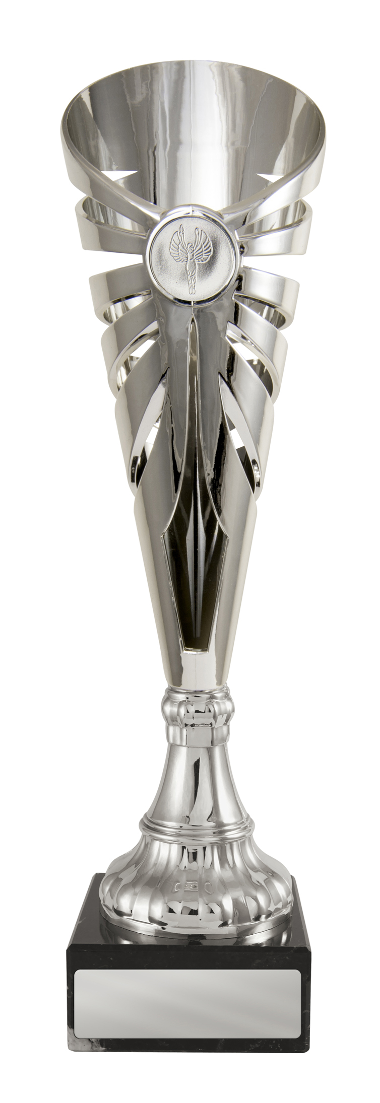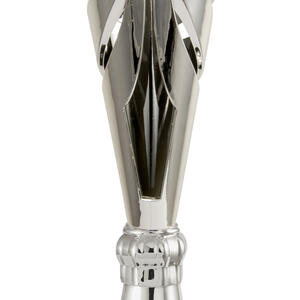 This trophy cup from Budget Cups offers an elegant and durable solution for recognising achievement in any setting. The polished silver finish and contemporary conical shape with a flared top create a striking visual impact, complemented by a decorative emblem. Supported by a black base, this award is crafted for quality and lasting recognition.