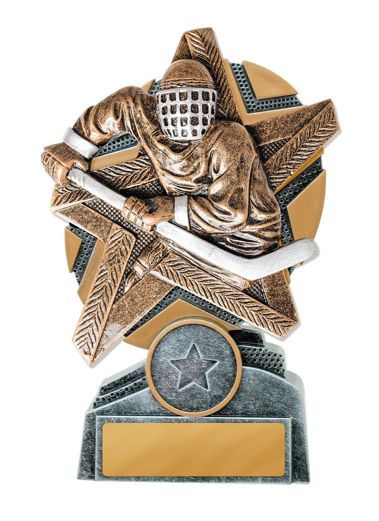 This ice hockey trophy highlights a bold goalie in action, crafted in bronze resin with silver detailing. The textured star design adds depth and movement, making it an excellent choice for recognising skill and teamwork on the rink.