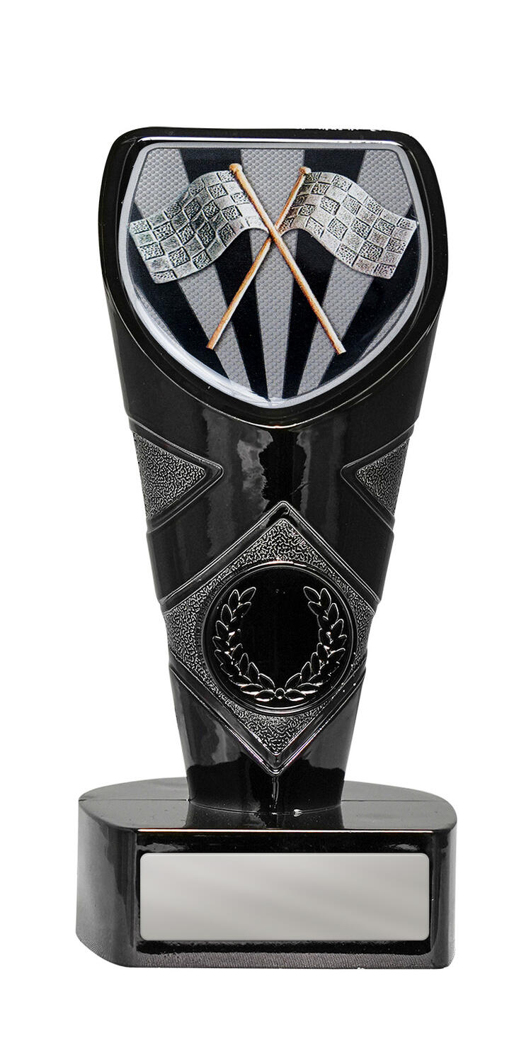Crafted for motorsport excellence, this trophy features a bold black and silver finish, highlighted by crossed checkered flags and a laurel wreath emblem. The wide topped design narrows to a rectangular base, providing a contemporary, professional presence. With a dedicated engraving plate for customisation, it is ideal for motorsport trophies at racing events or motocross competitions.