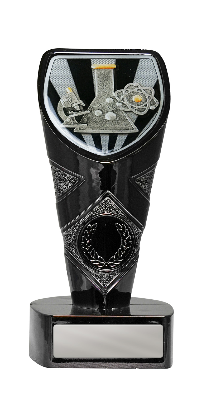 Celebrate academic achievement with this expertly crafted science trophy, featuring a striking shield shaped design in black and silver tones. Detailed science iconography including a microscope, atom, and laboratory flask, highlights its purpose as an academic trophy for science competitions and educational excellence.