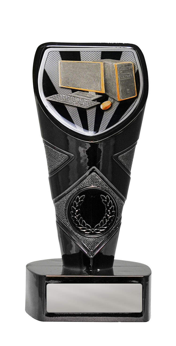 Designed for technology achievement, this trophy features a striking black, silver, and gold finish with a trophy like silhouette. The wide top section displays a detailed computer motif, keyboard, monitor, and mouse making it a distinct choice for computer trophies and education awards.