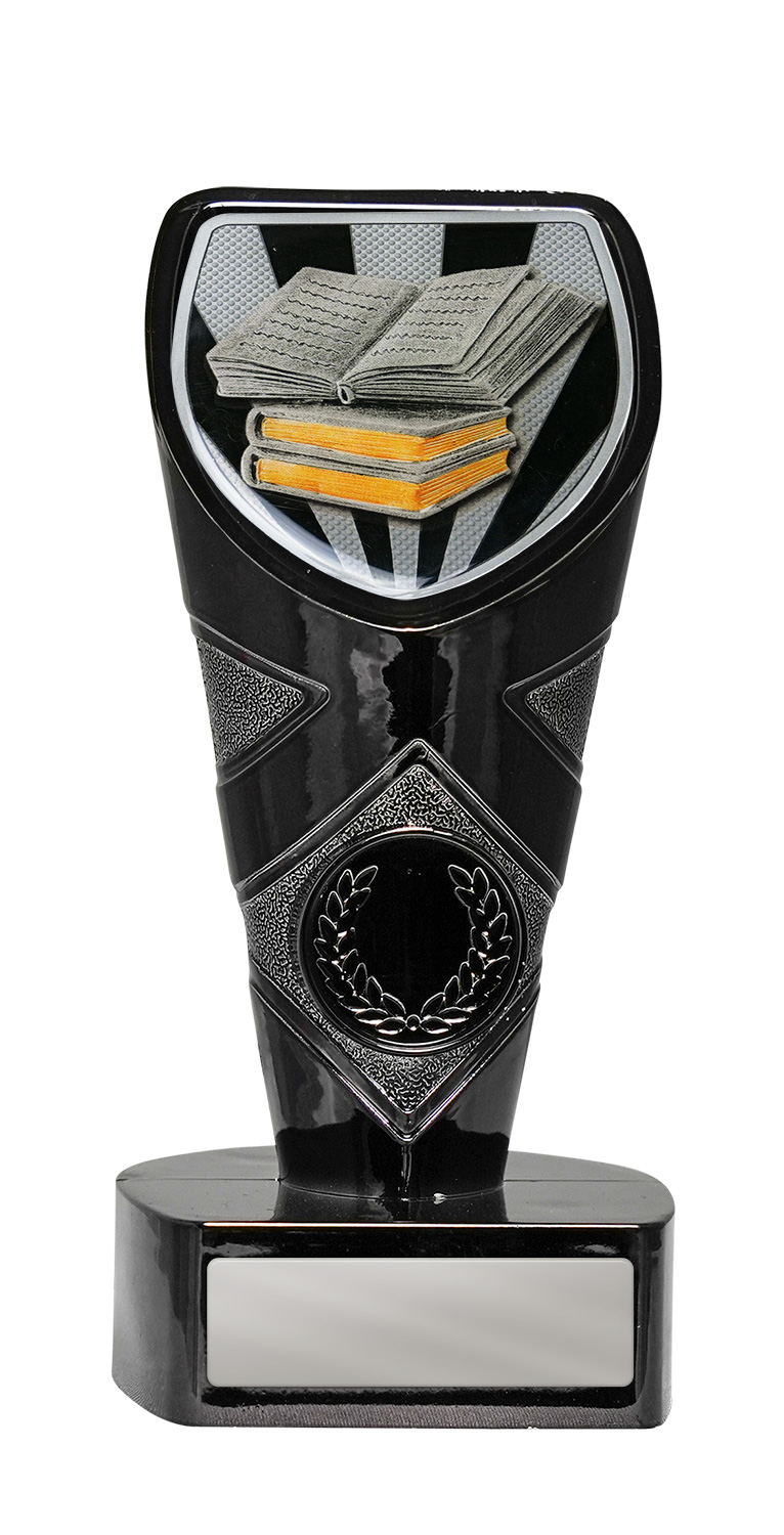 Celebrate academic accomplishment with a distinctively designed trophy that recognises student awards and book awards with impact. This trophy features a shield shaped top highlighted by an open book and stacked books design, set in a contemporary palette of black and silver. A laurel wreath emblem at the base adds a classic symbol of achievement, making it a memorable choice for honouring scholastic excellence.